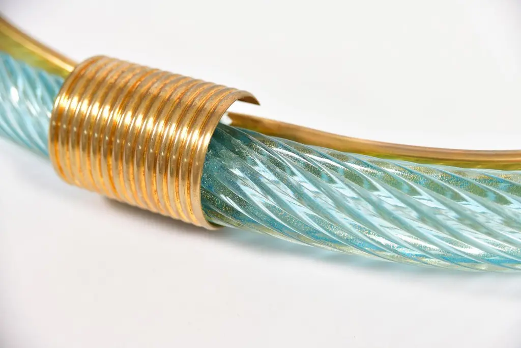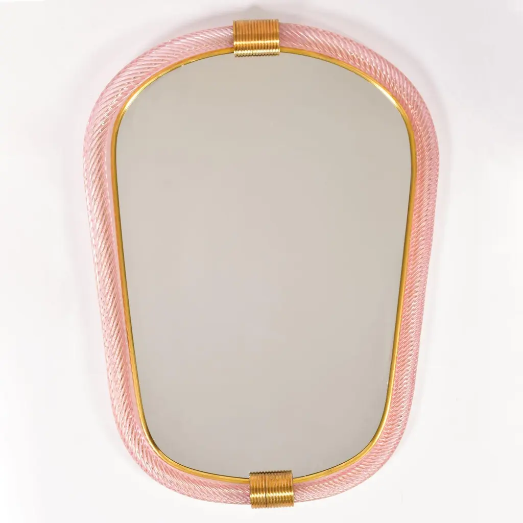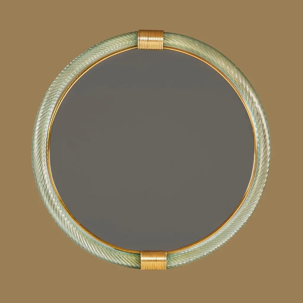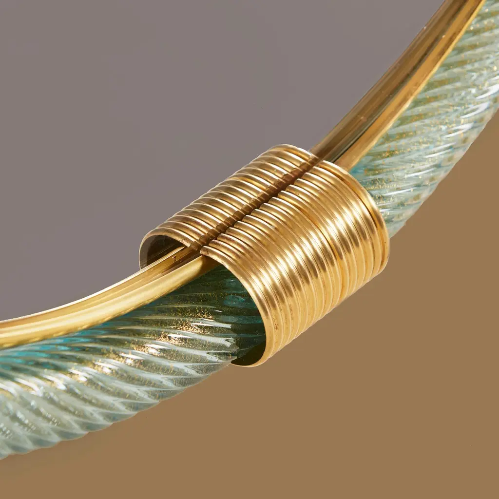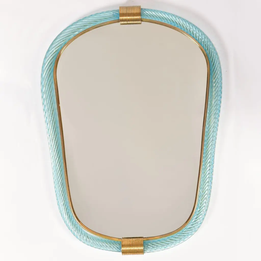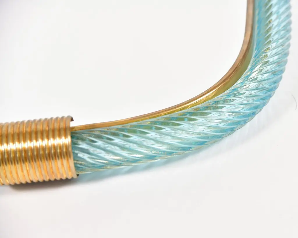 Pale blue hand blown and hand twisted Murano rope mirrors. Each with two brass fluted clasps at the top and bottom, the inner edge of the farm between the mirror and glass is edged with a slender brass filet.Also available in palest pink and emerald green.12-16 week lead-time if not in stock.