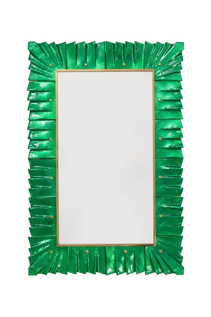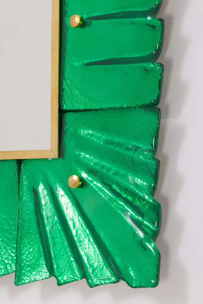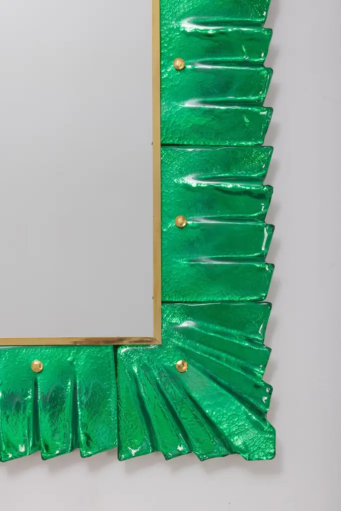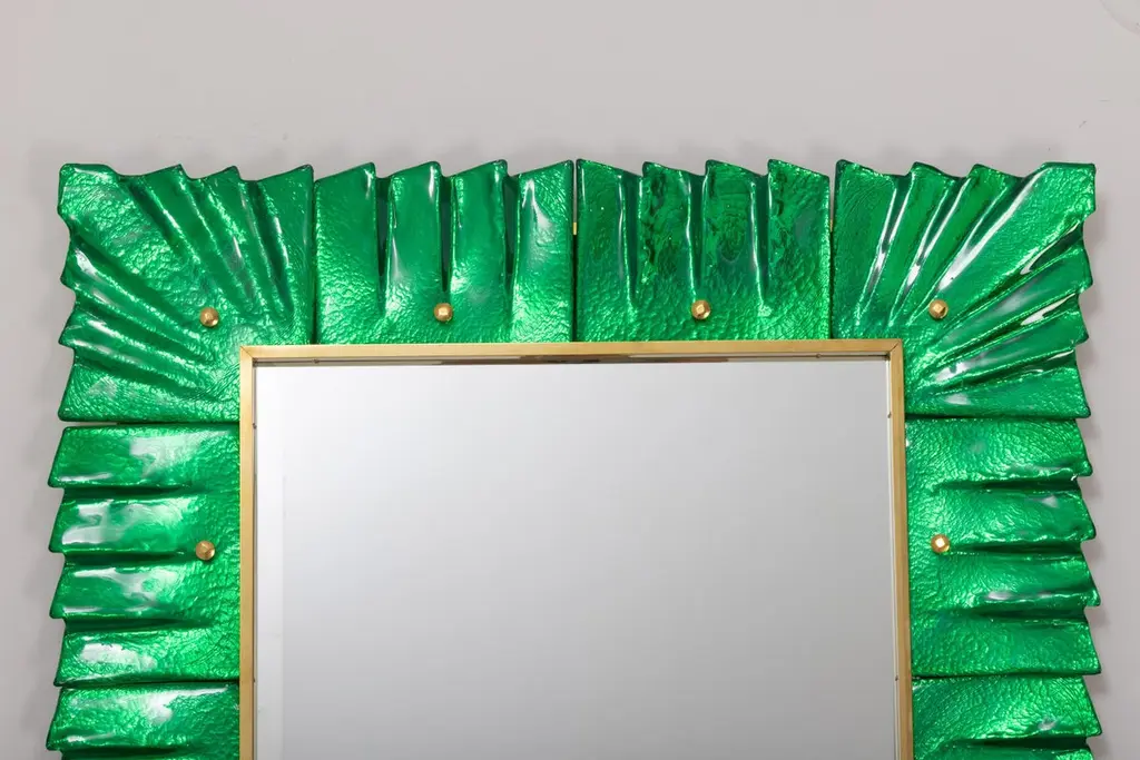 Pair of Murano emerald green glass framed mirrors, in stock.Rectangular mirror plate surrounded with undulating glass tiles in emerald green color held by brass cabochons. Handcrafted by a team of artisans in Venice, Italy. Can be easily hung vertically or horizontally with metal hanging bracket or hook on back. Weight Lbs 50.Located in our store in Miami ready for shipping.We offer a wide variety of colors and dimensions in addition to this piece.