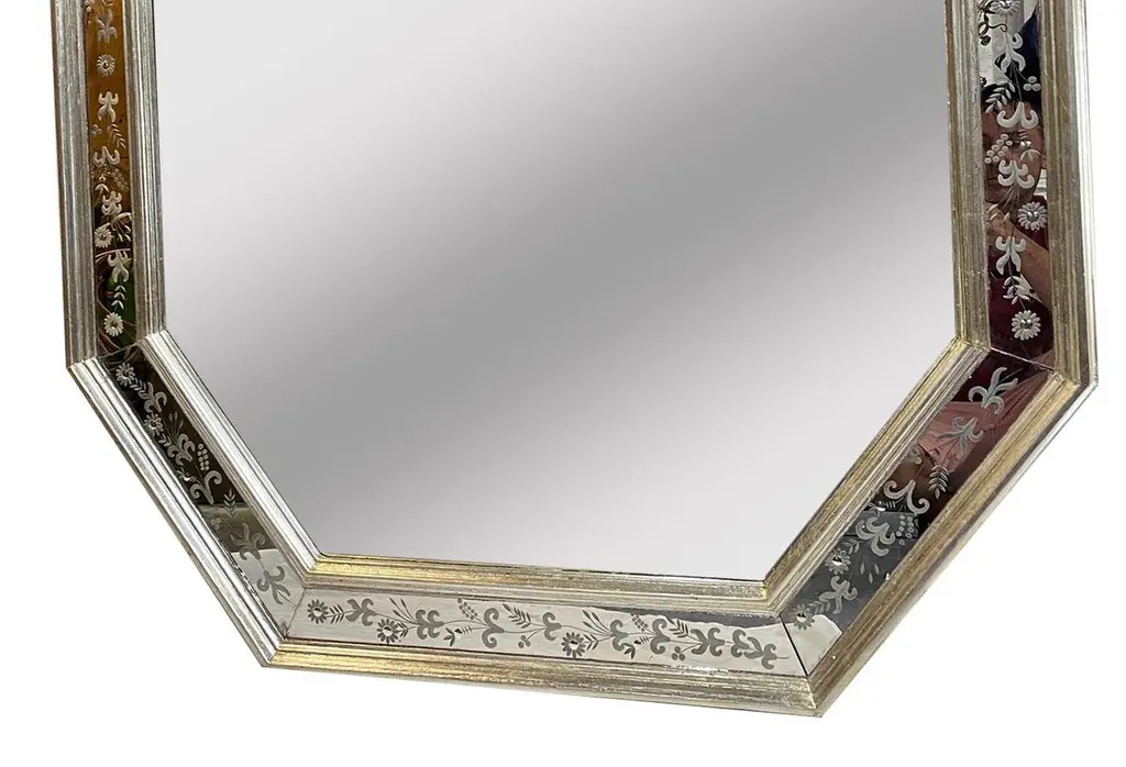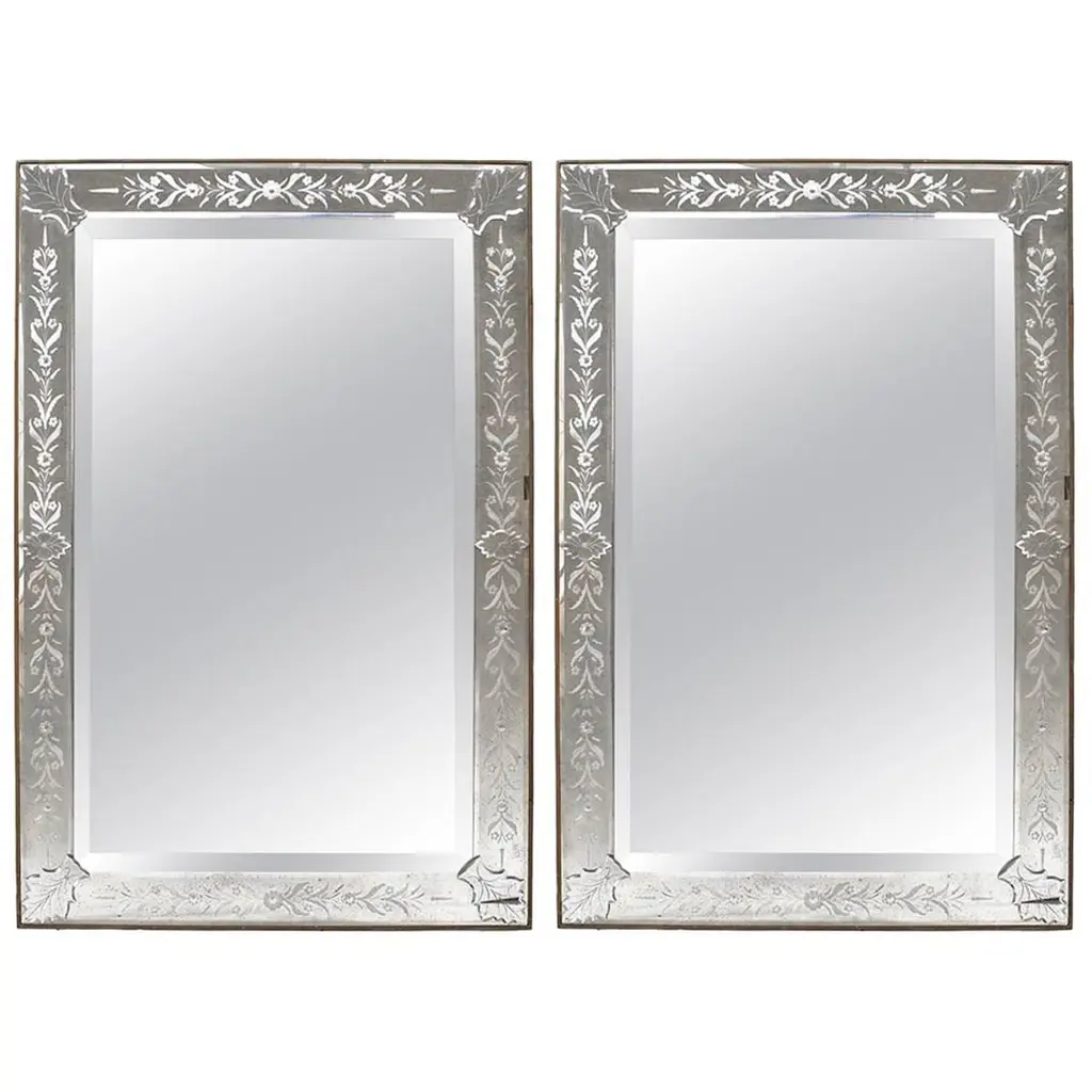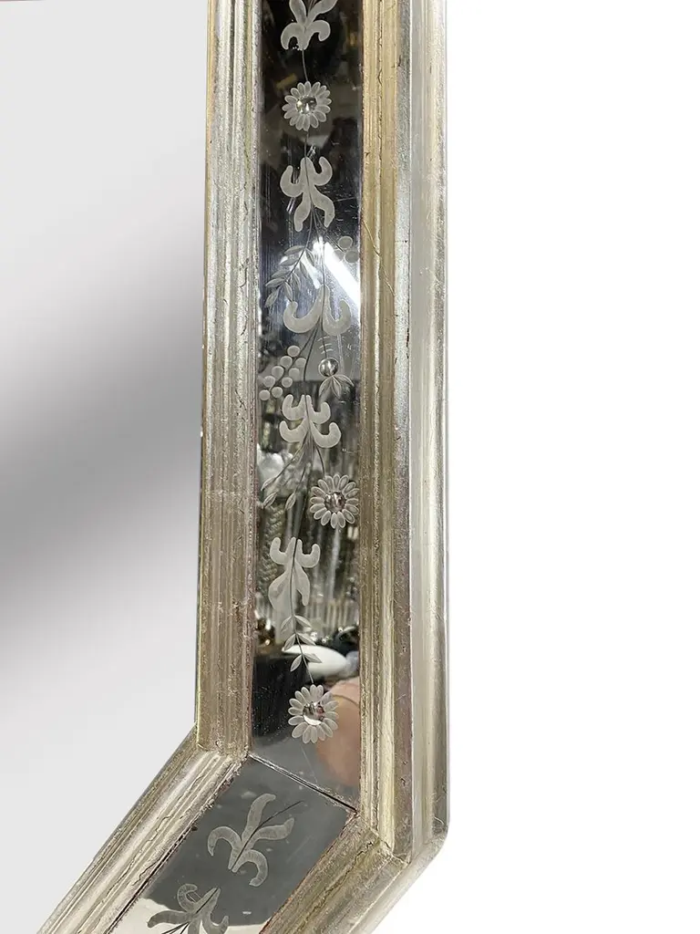A pair of 1940s Venetian mirrors with silver plated body and etched mirror insets. Sold individually.Measurements:Height: 53.75"Width: 43.75"