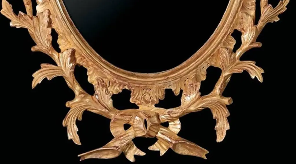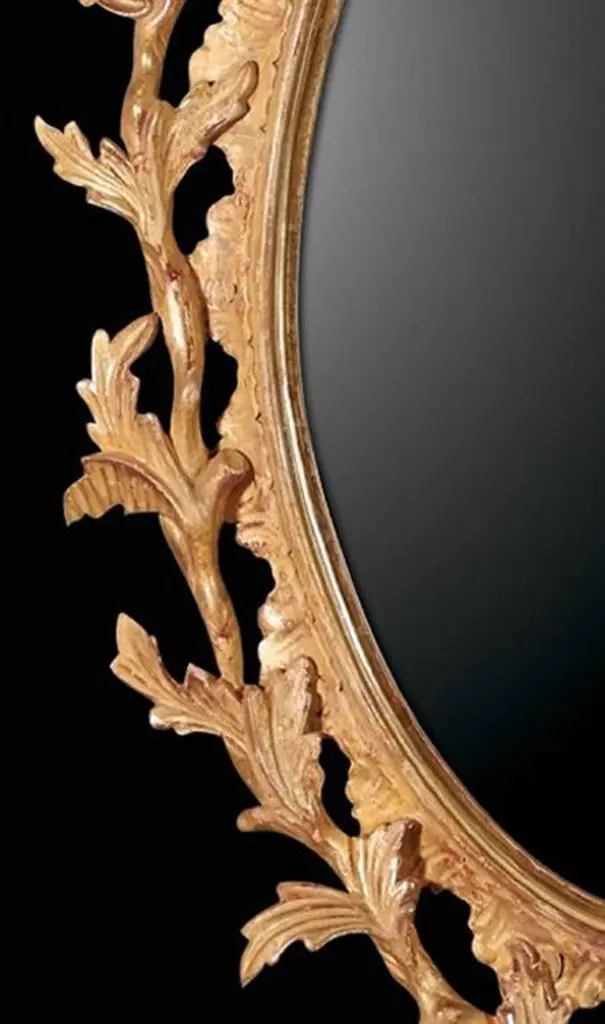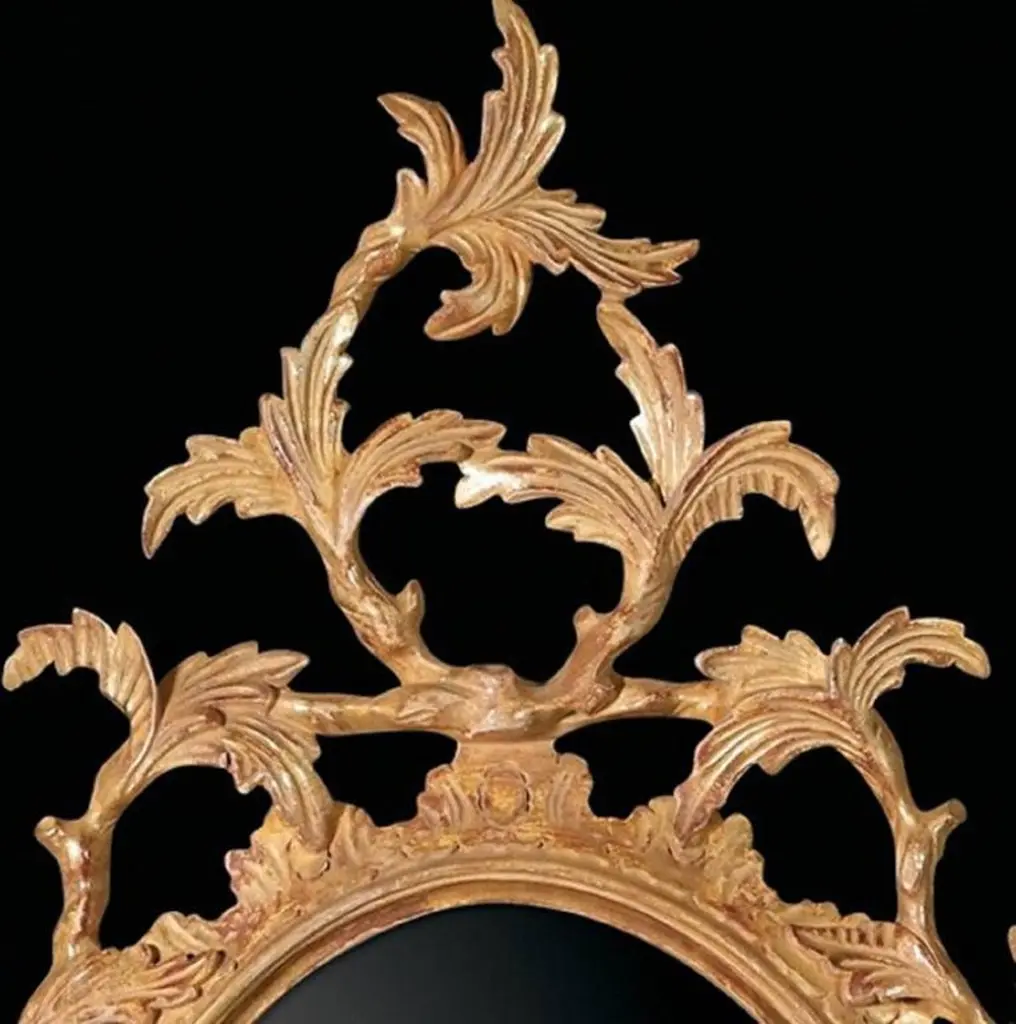 These small carved giltwood oval mirrors of Chippendale design illustrate the English Rococo period of the middle years of the 18th century.These small oval looking glasses are in a moulded inner frame carved in rocaille and surrounded by ribbon-tied crossed boughs of acanthus.Suitable for the bedroom, hall, lounge, or dining room.We are currently working to a 30-36 week lead time.