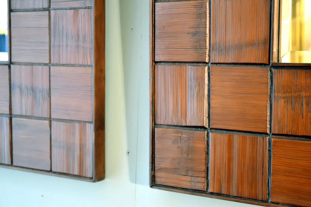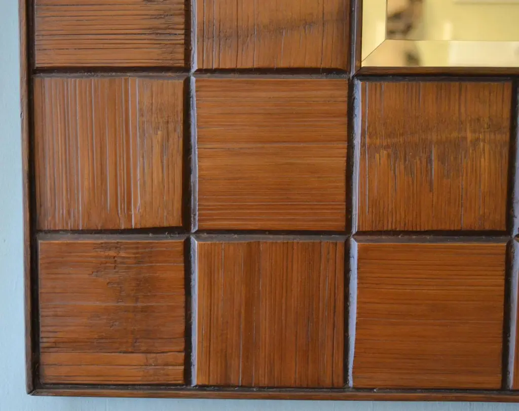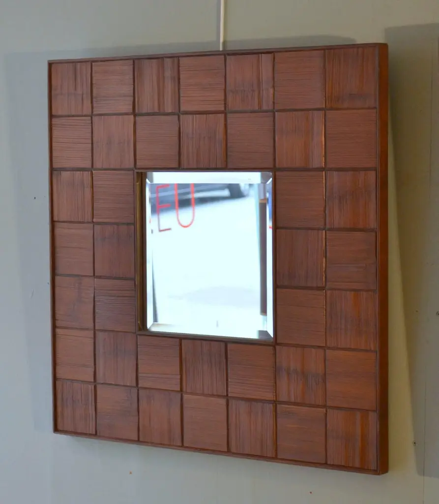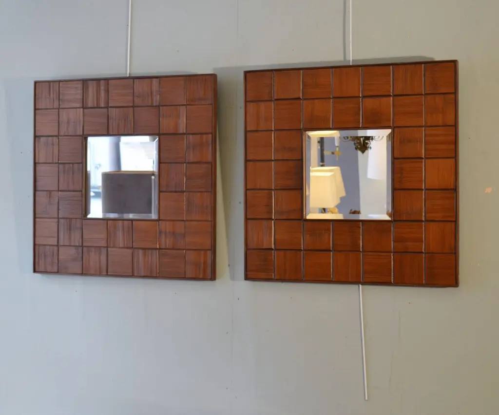Pair of square mirrors with a wide decorative hand carved walnut border with a textural relief in horizontal and vertical relief squares. The quality square mirrors are bevelled. (dimensions; 29 x 29 cm), made in Italy 1960's signed GJ., Italy 1960's