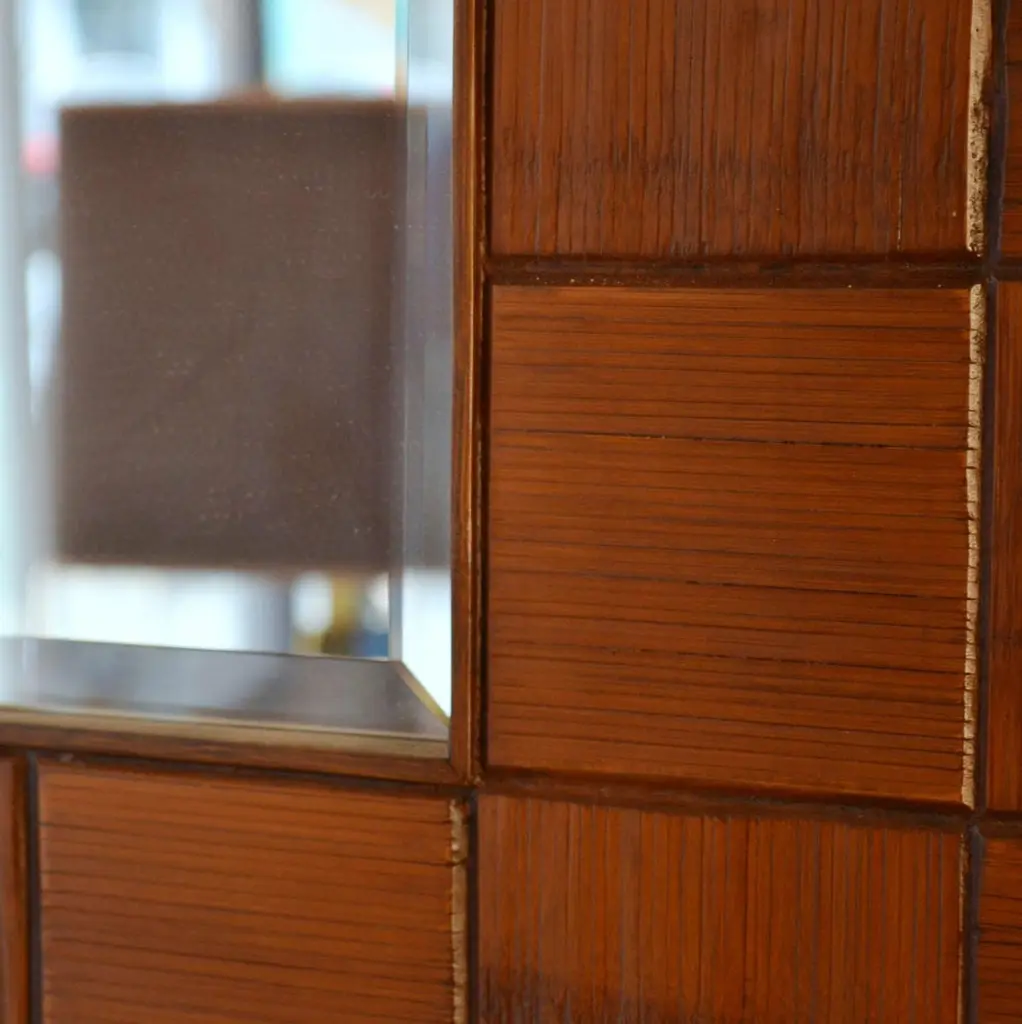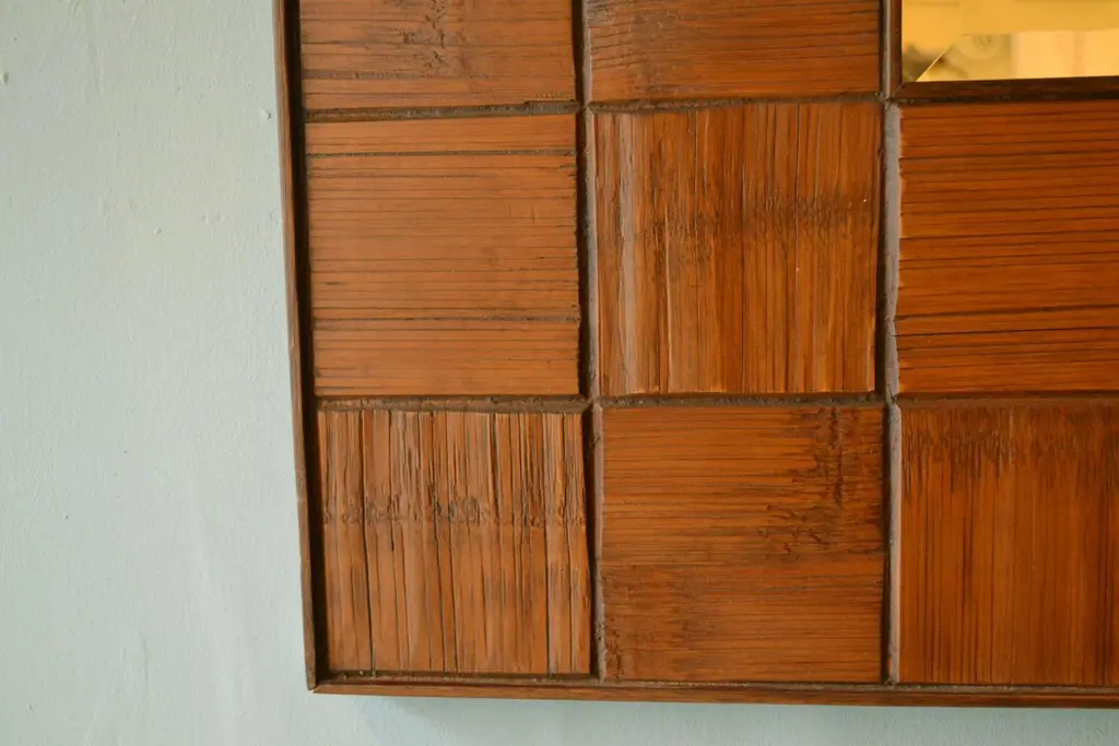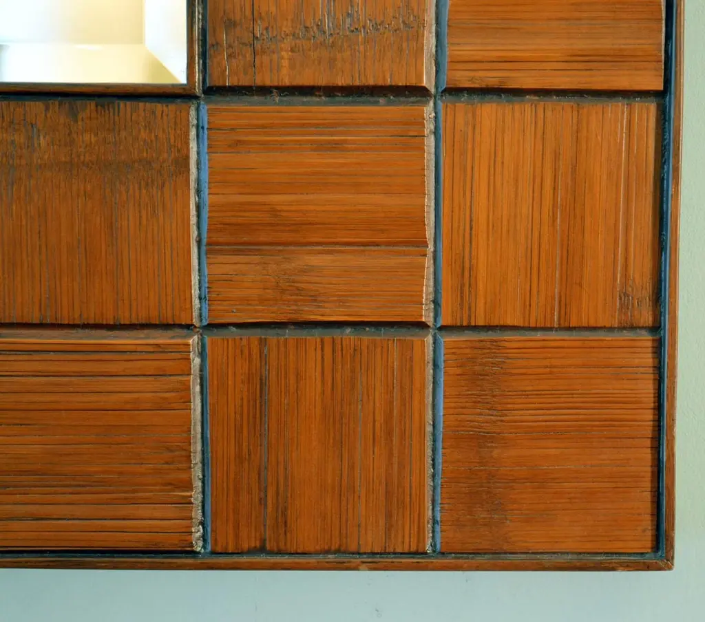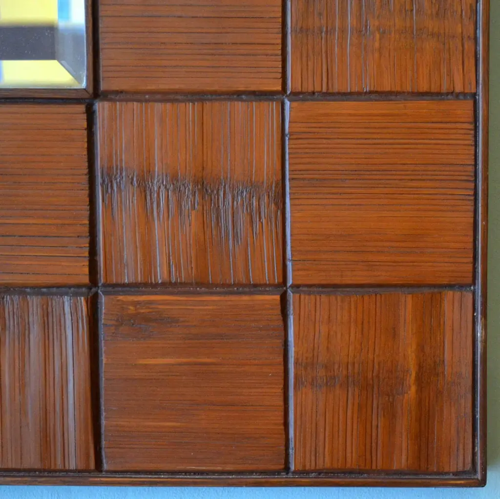 Pair of square mirrors with a wide decorative hand carved walnut border with a textural relief in horizontal and vertical relief squares. The quality square mirrors are bevelled. (dimensions; 29 x 29 cm), made in Italy 1960's signed GJ., Italy 1960's