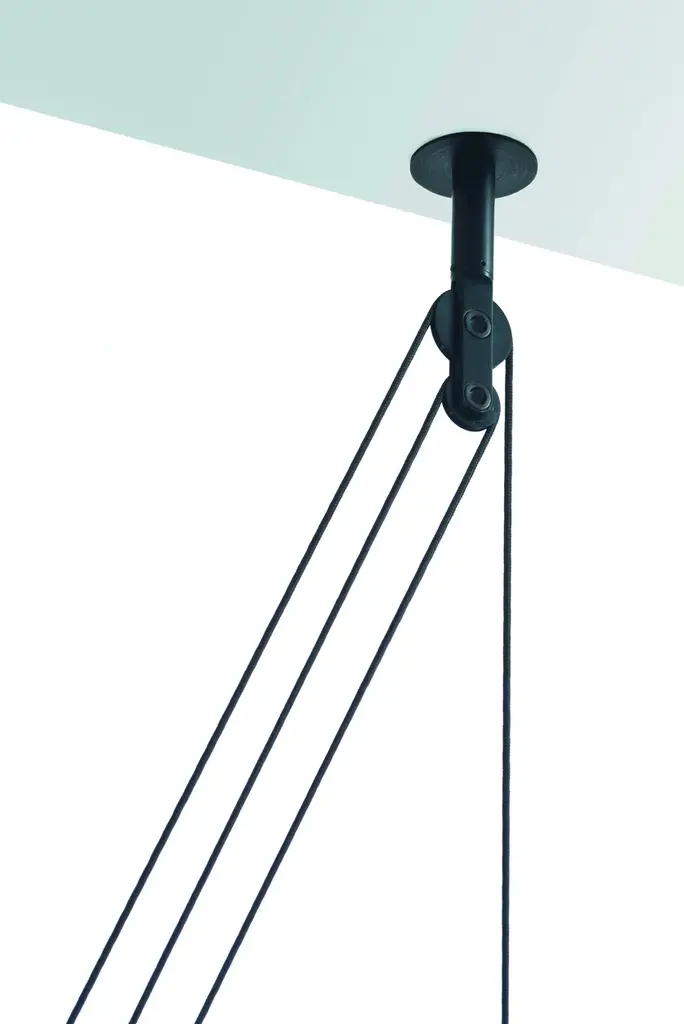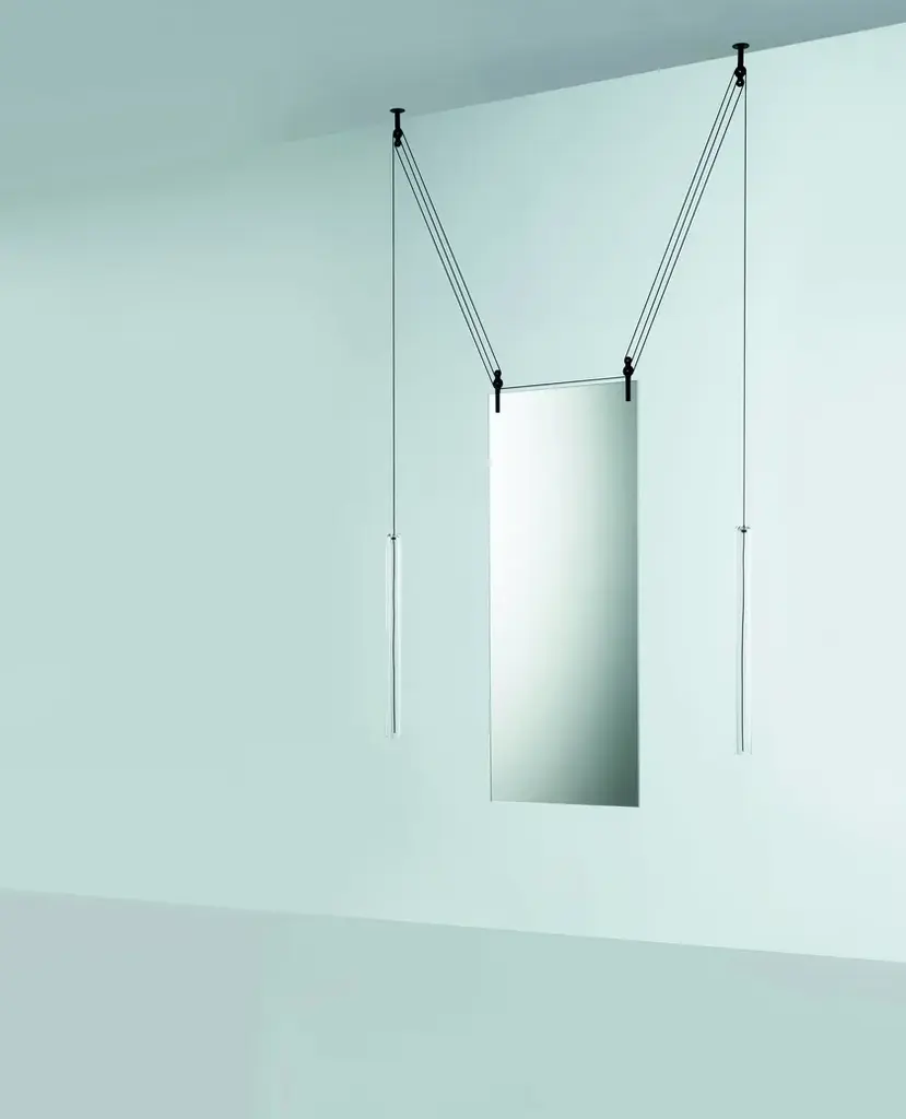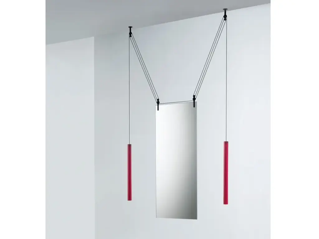 A double-faced mirror hanging from the ceiling available in three versions that, thanks to a system of counterweights, cables and pulleys, can be easily vertically positioned.The counterweights, that go up and down balancing the movement of the mirror, are cylinders in red, brown or neutral blown glass.The cables and pulleys are in black aluminium.Because of the double-faced feature, this mirror is perfect to be hung near a wall, but also in the middle of a location as dividing and/or screening element.Attention, the cylinders in blown glass can present irregularities, which are an intrinsic feature of the product and can not be a reason for complaint