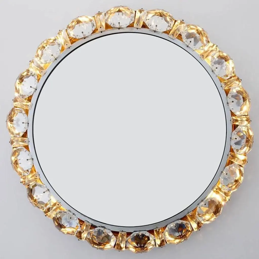 A high quality and handmade illuminated crystal glass mirror by Palwa (Palme & Walter), Germany, manufactured in Mid-Century, circa 1960 (1950s- 1960s). Two mirrors are available. The price is per mirror. They are sold individually or as pair.This mirror also can be used a large sconce or wall light.It is made of a nickel-plated brass frame decorated with large diamond and rectangluar faceted handcut crystal glasses. The backplate is labeled with Palme & Walter. It is in very good condition, it has been professionally cleaned, and it is ready to use. The piece has four sockets for screw base bulbs E14 (max. 40 W per bulb).Light bulbs are not included. It is possible to install the mirror in all countries (US, UK, Europe, Asia, Canada, ...) although it may be necessary to purchase different light bulbs suitable to local electricity. The fixture also can be used with a dimmer.It is very similar to the mirrors manufactured by Bakalowits & Soehne, Austria, Vienna.