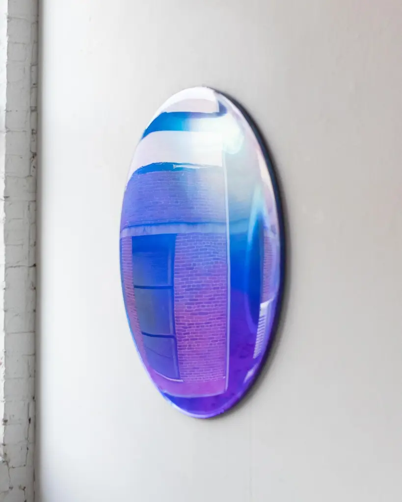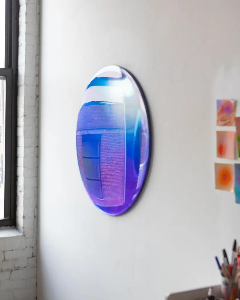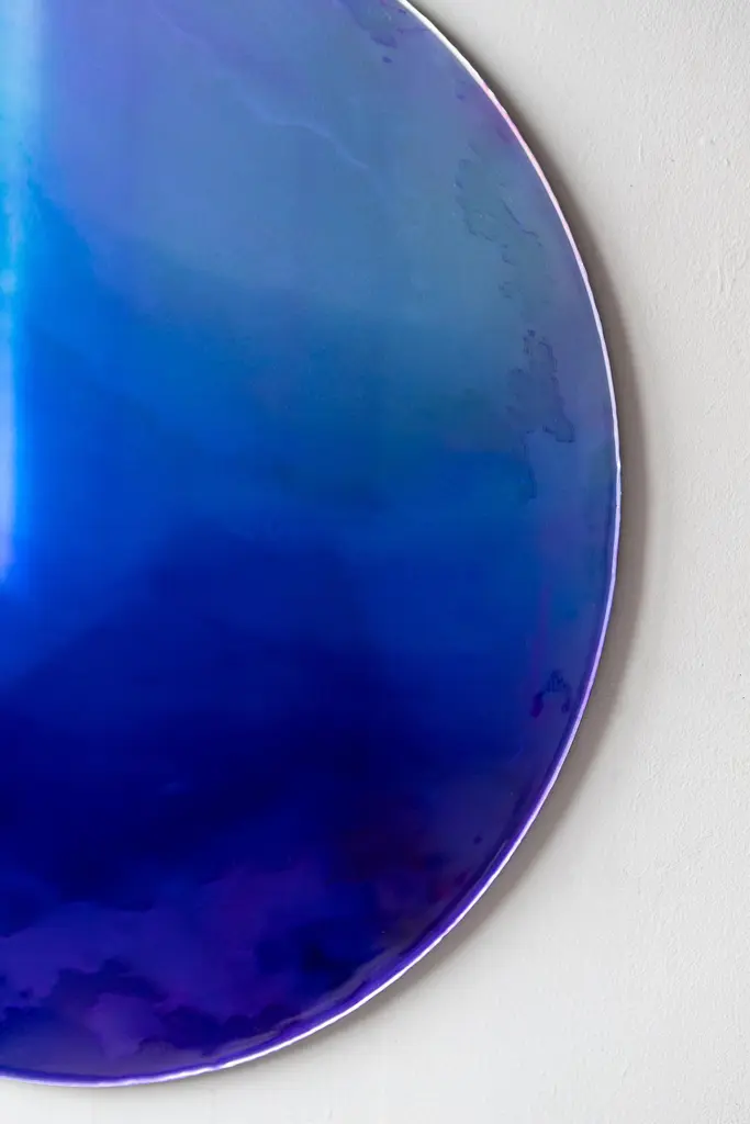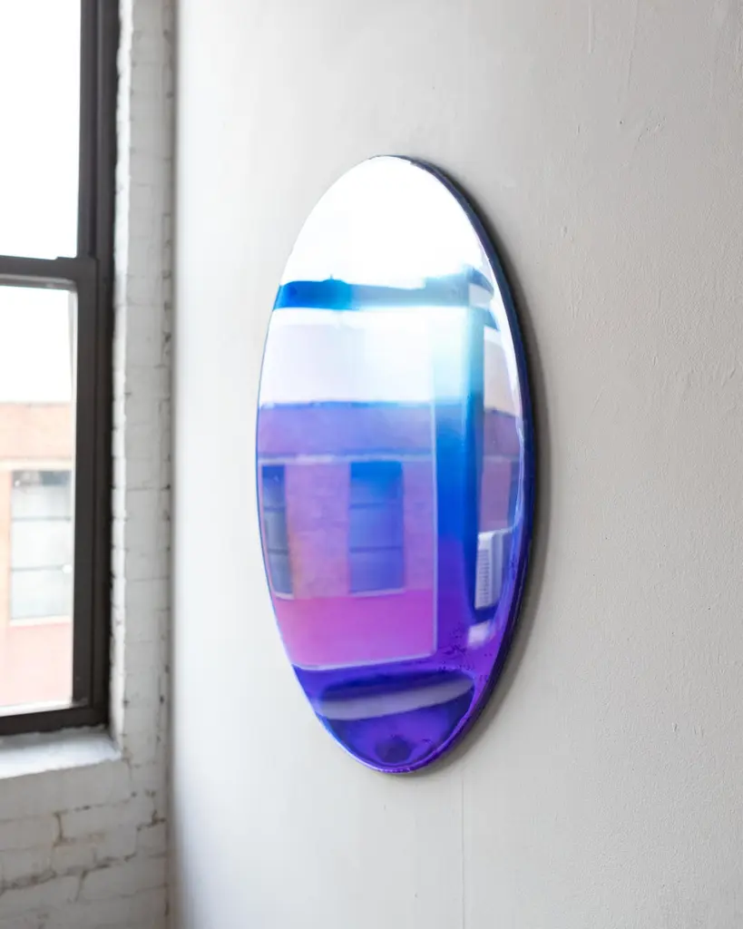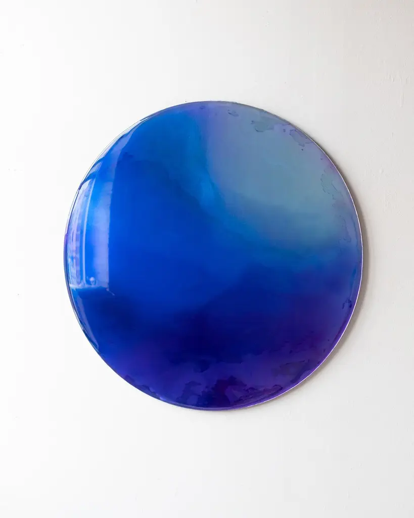 Dancing with my Shadow by Courtney Kinnare2024Resin, Acrylic, Ink, & Pigment Powder on Mirrored GlassDia 30"These functional art pieces build a color story through multiple layers of translucent tinted resin over a mirrored glass base. Throughout the day as the light changes, their vibrant hues shift in color and tone - kaleidoscopic portals offering new perspectives each time you view them. Courtney considers this her signature series and has been developing the technique for over two years.To preserve longevity of the materials and color, this piece should not be placed on a wall with direct sunlight.Lead time: 6-7 weeksFully customizable by size and color.One of a kind.