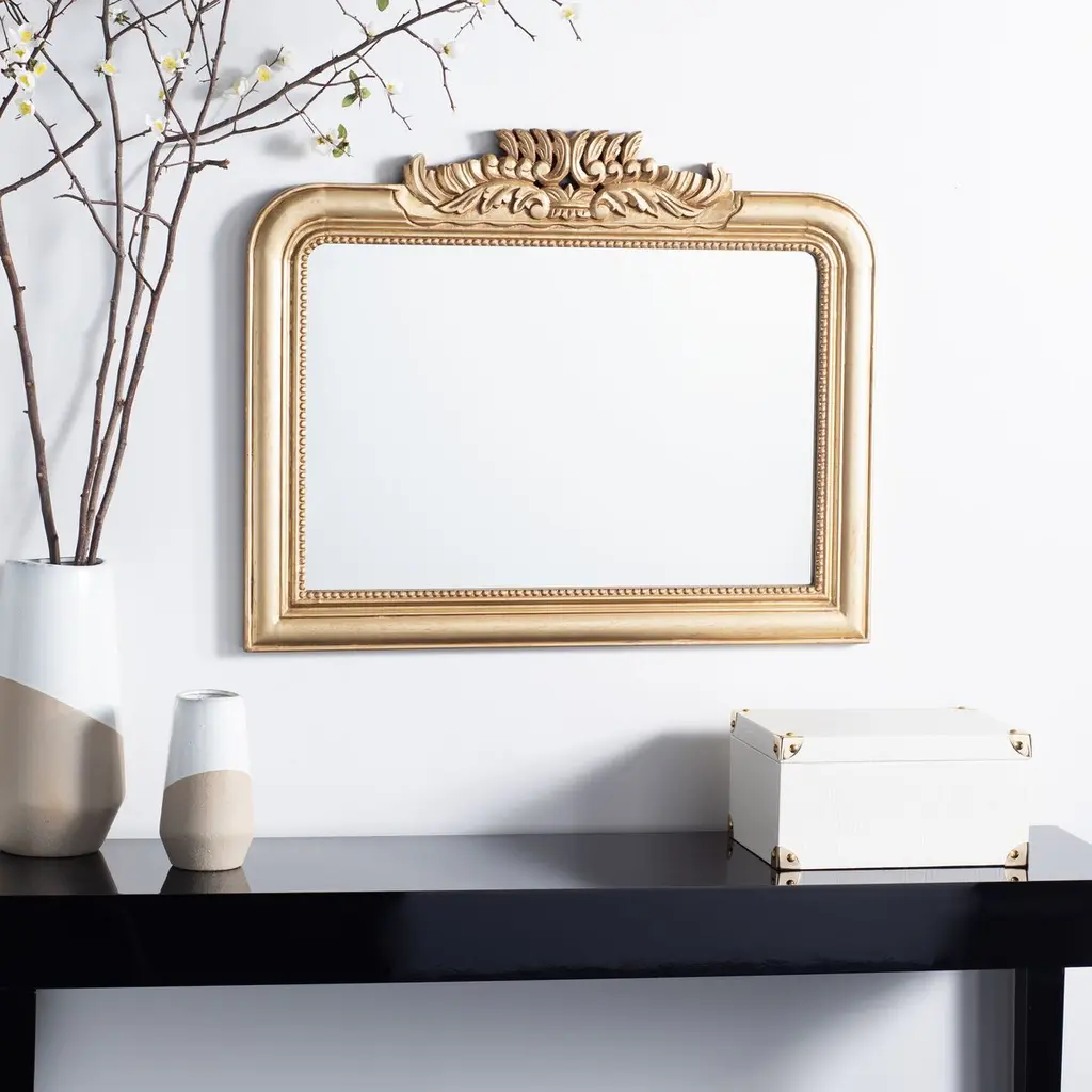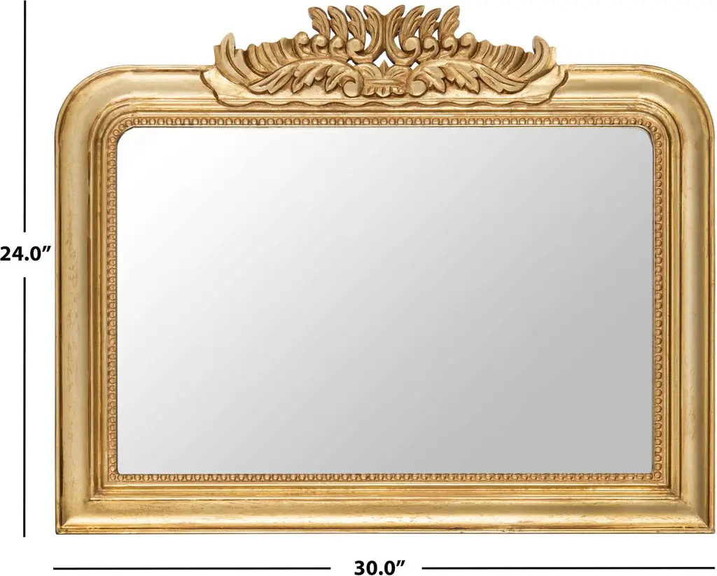 With its crown of acanthus leaves, rounded top corners, and warm gold finish, this mirror's frame will add Old World sophistication to a room.