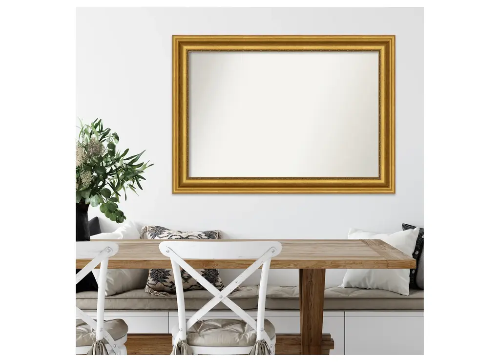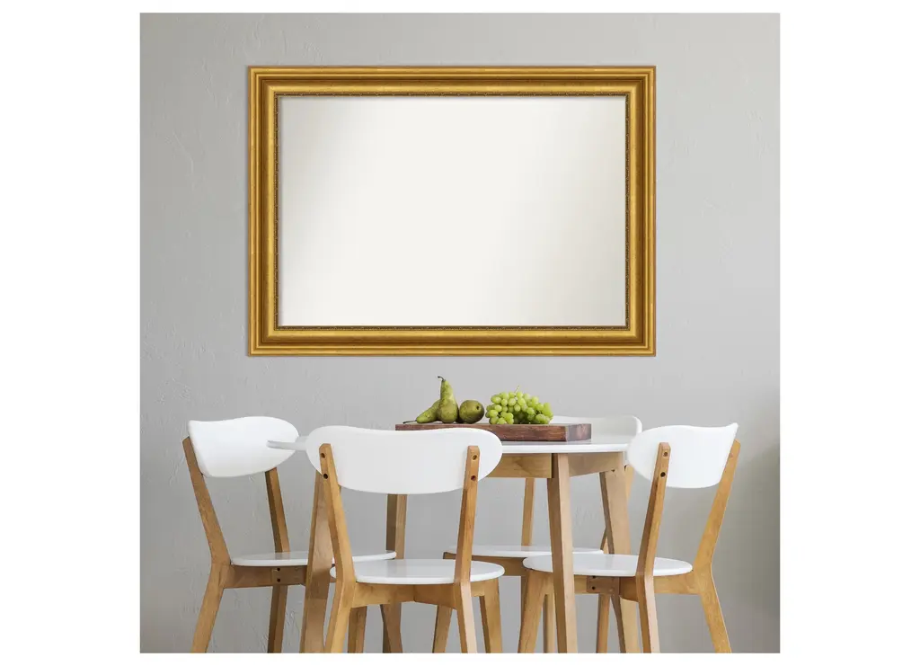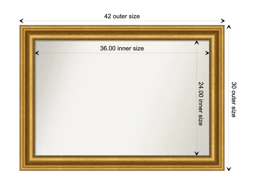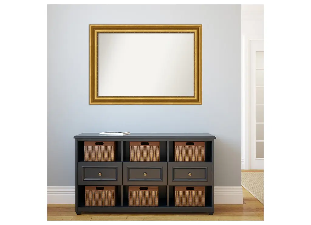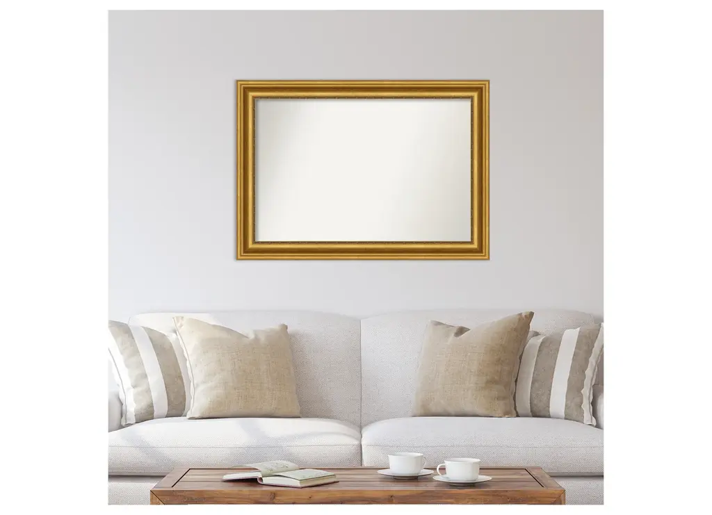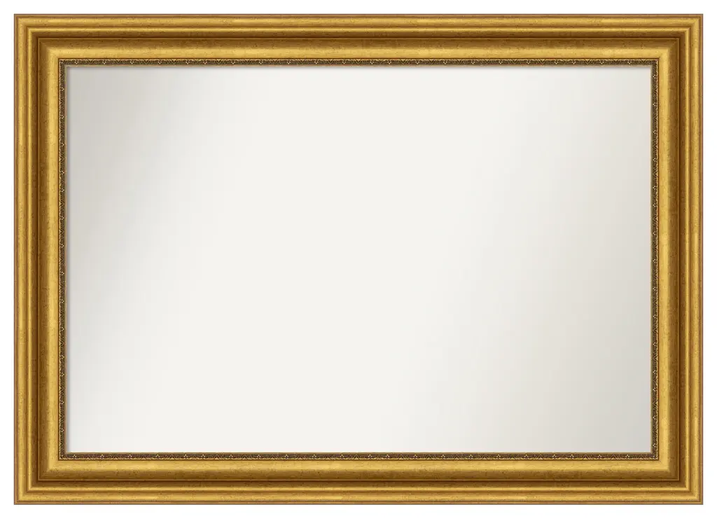 Give your home or office the finishing touch with this Non-Beveled Wall Mirror framed with the Parlor Gold frame. Individually made using traditional custom framing techniques, it has the quality you would expect from your local frame shop. It holds its value with premium finishing that can be appreciated up close.Features:MIRROR DETAILS: This mirror features premium glass for a clear, undistorted image and has a non-beveled surface to maximize the viewing area.FRAME DETAILS: The Parlor Gold Frame is a gold brushed frame with antique tan patina. The frame has an ornate, scalloped design with an embossed inner edge. The frame is 3.25 in. wide and stands 1.25 in. off the wall.PROTECTIVE BACKING: This wall mirror is finished with a solid surface backing to ensure stability and prevent moisture and dust buildup.HASSLE-FREE HANGING: All mirrors have durable hanging hardware attached to the back to hang vertically or horizontally, along with hanging hooks and nails.ASSEMBLED IN THE USA: Each piece is assembled to order in Madison, WI USA.FOR HOME OR COMMERCIAL USE: Because of our attention to detail and focus on artistry, architects, interior designers, and homeowners alike choose this mirror to create beautiful living spaces.