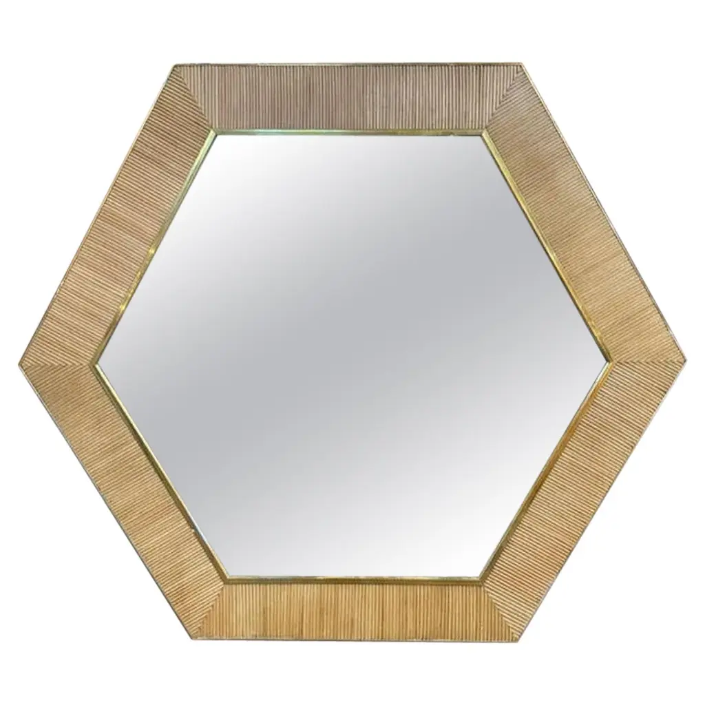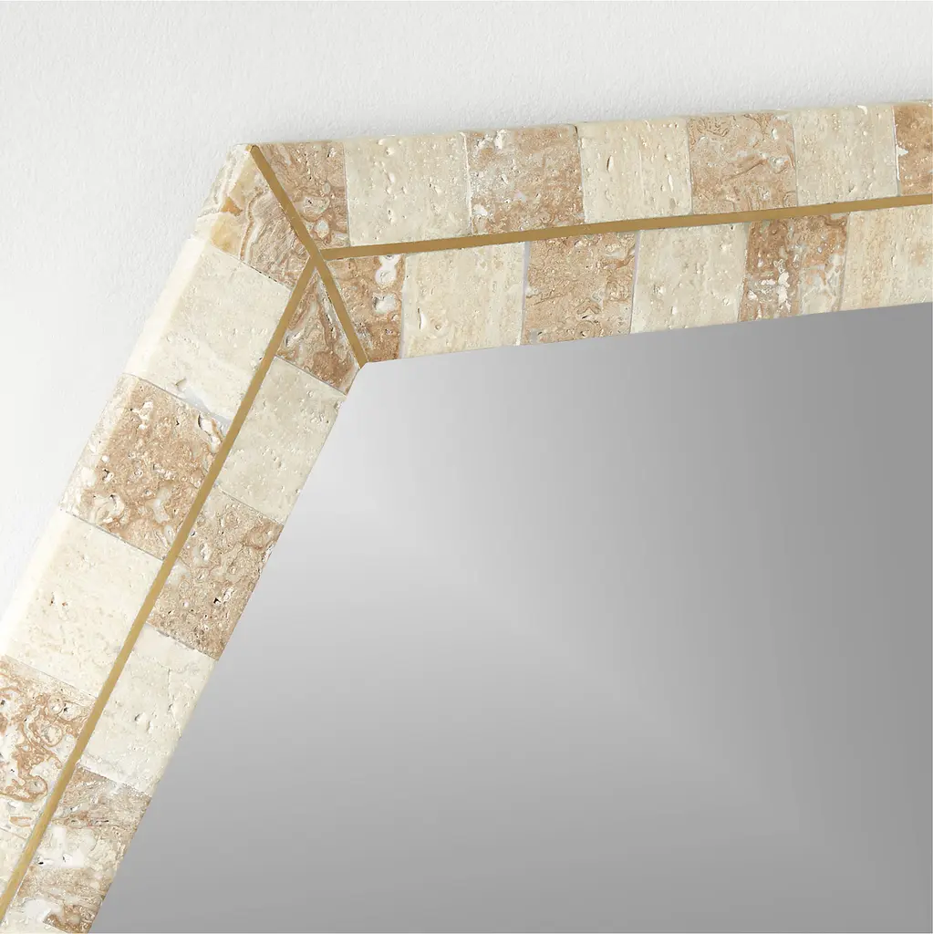 Hexagonal travertine mirror highlights the material's organic texture and character in sculptural style. Natural Turkish travertine is inlaid by hand to create an alternating checkered pattern, accented with a slim brass detail. No two will be exactly alike. CB2 exclusive.