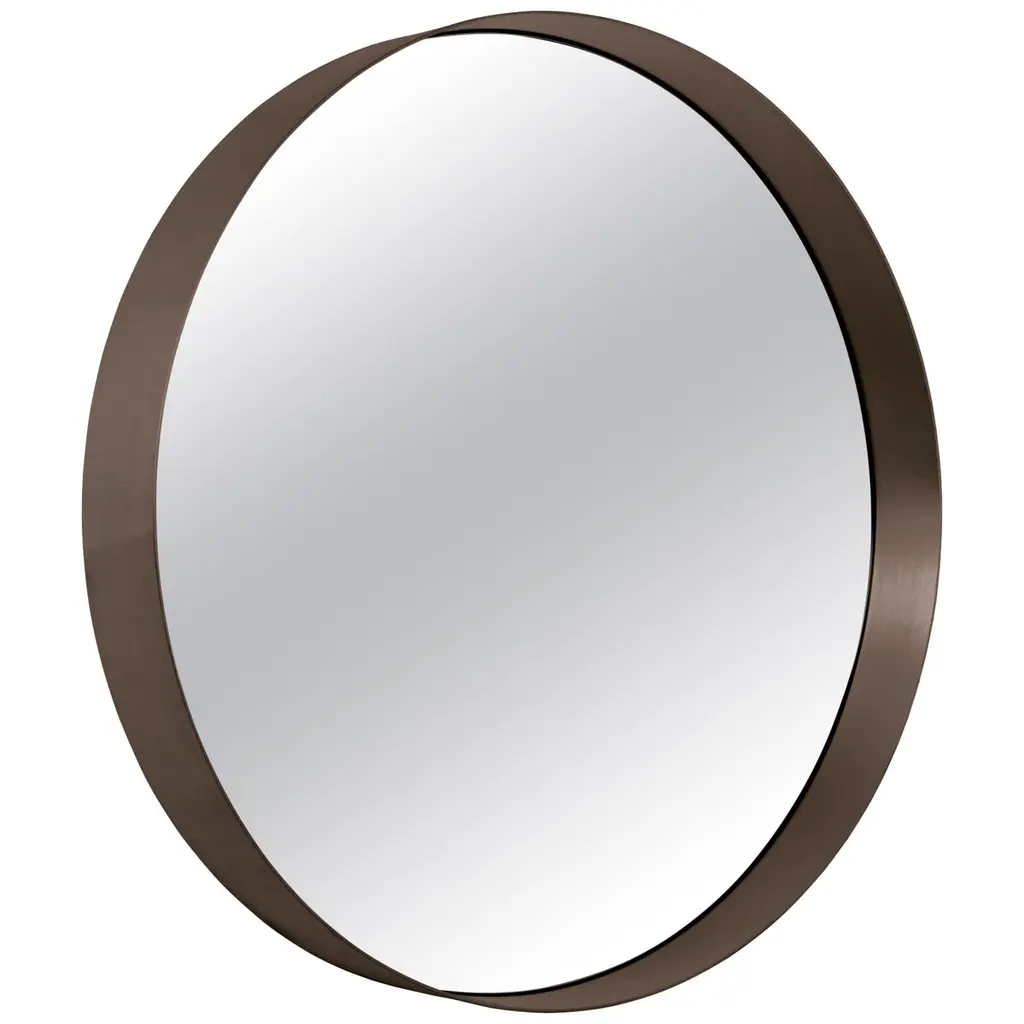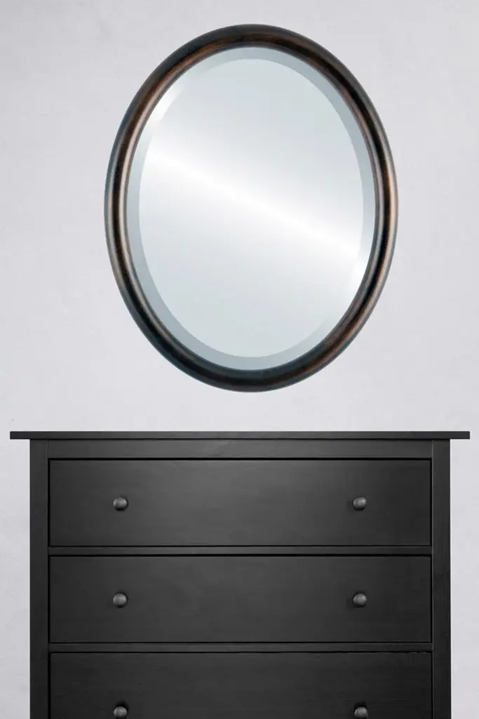 A wood frame with a one inch wide half round profile. Rubbed Bronze has a distressed look, allowing for a beautiful bronze to peek through a black finish. Rubbed Bronze is designed to match contemporary sink faucets, appliances, and other decor. This Framed Mirror arrives ready to hang with hardware pre-installed for vertical or horizontal hanging. This Framed Mirror arrives ready to hang with hardware pre-installed for vertical or horizontal hanging.