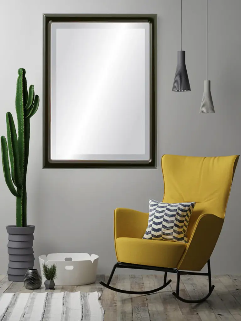 A wood frame with a one inch wide half round profile. The cut of this frame is simple and minimalist. The high Gloss on this solid black frame gives a contemporary and classy look. The Framed Mirror features a Gallery Quality Hand Finished Wooden Frame with a Distortion Free 1" Beveled Mirror. This Framed Mirror arrives ready to hang with hardware pre-installed for vertical or horizontal hanging.