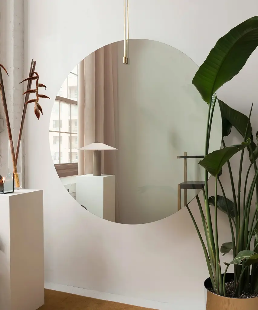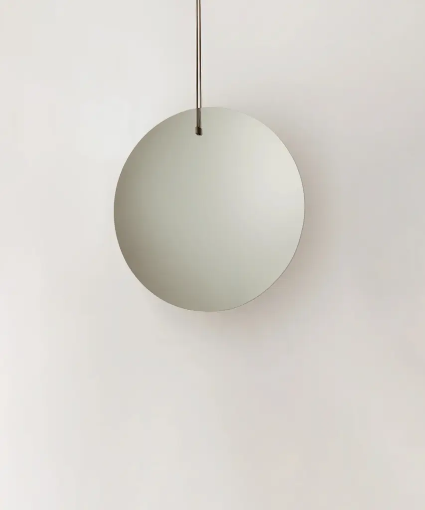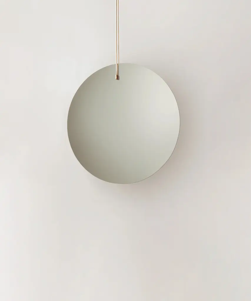 This dramatic and bold mirror is intended to be used either as a focal point in front of a wall or window or as a sculptural room divider. Suspended from the ceiling by metal rods, it is made of a one-way mirror. While one side offers a slightly dark-hued mirror, the other side appears to be grey-tinted glass. The mirror attaches to the ceiling with a rectangular brushed brass plate that can either be covered by plaster or exposed. A One-way mirror is a reciprocal mirror that appears reflective on one side and transparent on the other. The perception of one-way transmission is achieved when one side of the mirror is brightly lit and the other side is dark. This allows viewing from the darkened side but not vice versa. Each piece is designed and hand-produced by Coil + Drift, a lauded New York's Catskill Mountains-based design studio known for its vividly three-dimensional and material-forward collections.
