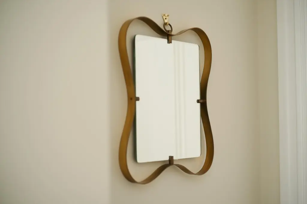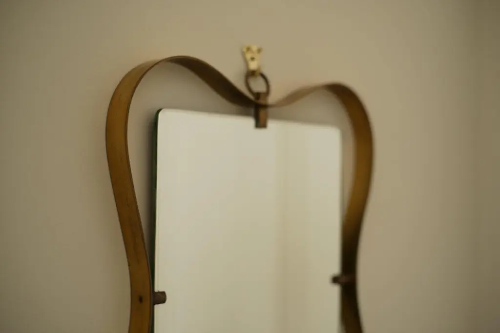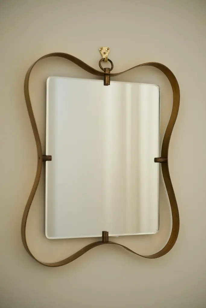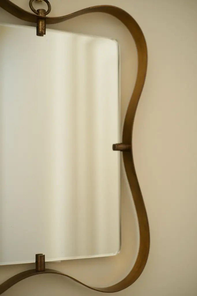 A curvaceous mirror by Fontana Arte in patinated brass, c.1950s.Dimensions: H 40 x W 32 x D 3 cmMaterial: Mirrored Glass and BrassCondition: Very Good