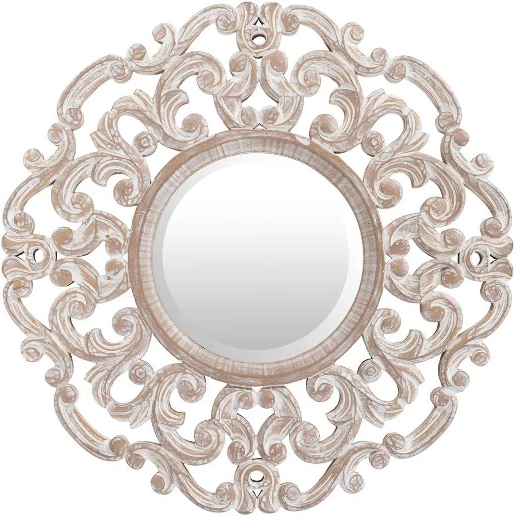 The Paulina Wall Mirror features a lovely round carved frame in a natural wood finish. Finish: Natural wood. Overall Size: 36"RD. Mirror Glass Size: 14"RD. Weight: 15 LBS. Material: MDF, Veneer, Glass Mirror, Wood, Iron. Wall Mounting: Two "D" ring attachment points for ease of access wall mounting is included to hang mirror. The hand crafted details produced by a skilled artist lends itself to a unique technique and will vary slightly. Country of origin: India.Features:No assembly required, simply mount to wall.For over a century, Bassett Mirror has been synonymous with style and quality, transforming homes with its sophisticated and timeless designs. With a wide-ranging collection of furniture, lighting, mirrors, and art, Bassett Mirror seamlessly blends modern style with classic appeal. From rustic modern to luxe glam, each piece is thoughtfully crafted to inspire and elevate any space. Committed to exceptional value and customer care, Bassett Mirror makes it easy for homeowners to create beautiful, personalized interiors with confidence.