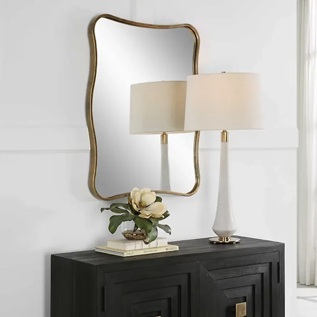 The Pavia Vanity Mirror from Uttermost channels designer David Frisch's love for fluid, organic forms. Its undulating frame creates a gentle movement across the wall, breaking away from standard geometric constraints. The iron construction provides structural integrity while maintaining a light, almost whimsical presence. Its adaptable mounting system allows for both horizontal and vertical placement, letting you maximize its artistic impact in any bathroom area.