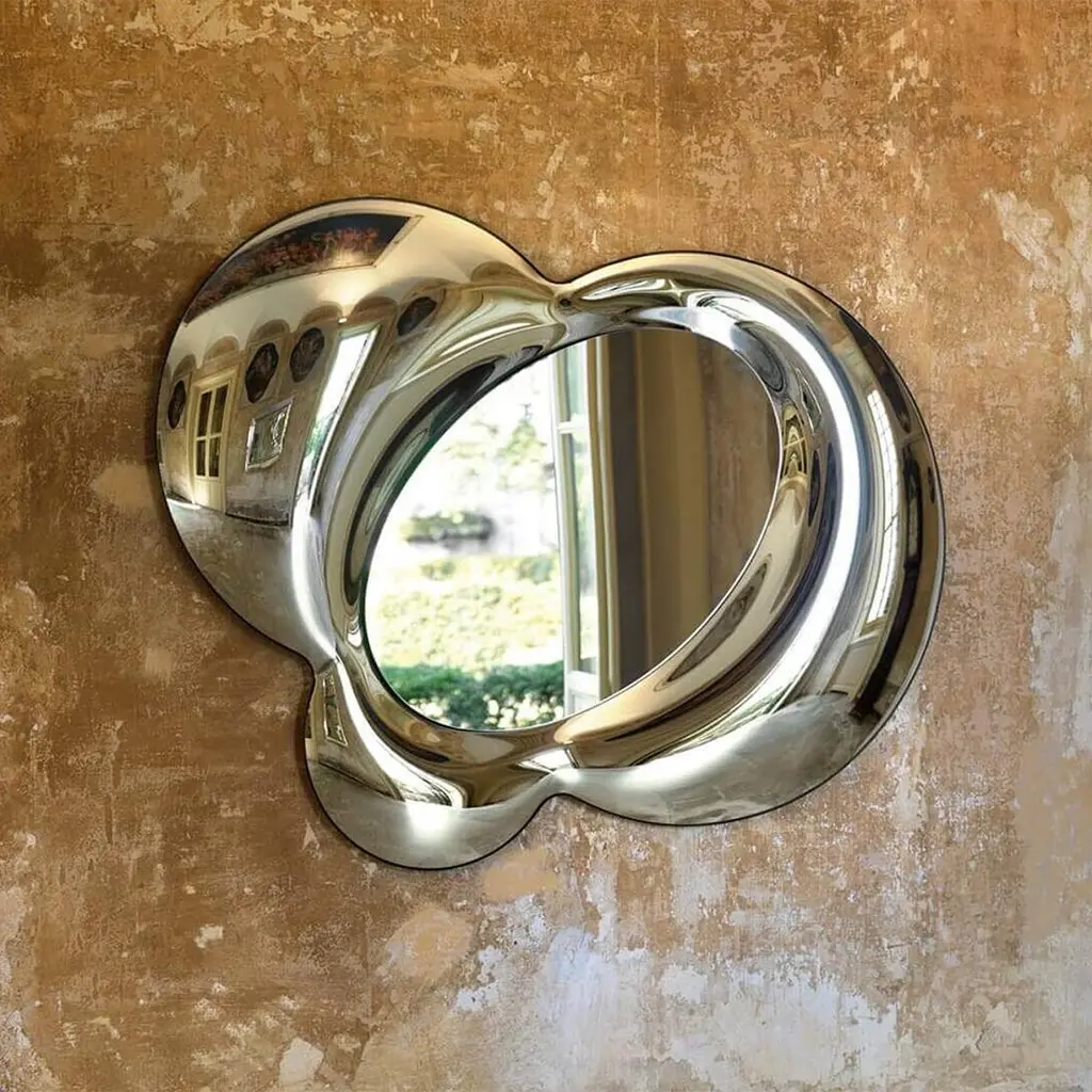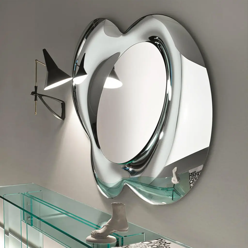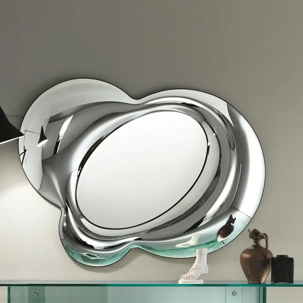 Mirror Pearl Smooth with frame in fused mirror glass,8mm thickneess. With flaat central mirror glass, 5mmthickness. with fixing panel at the back with differenthanging positions.