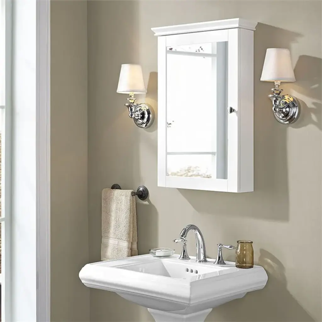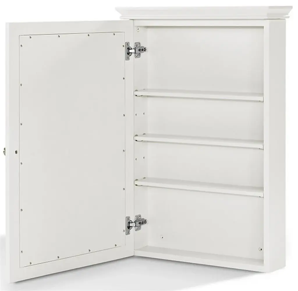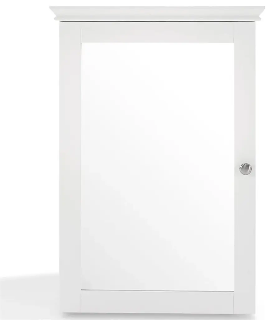 Remodeling a bathroom can be an expensive undertaking, but savvy homeowners know that a few little changes go a long way toward improving a space. Replacing a dated, worn medicine cabinet is one of those touches. Clean lines and lots of mirror space improve any décor, which is why the mirrored wall cabinet is so popular. A large glass mirror is ideally complimented by a "just right" border of genuine wood, capped nicely by modern flared molding. Inside, you will find plenty of storage space for those little personal items that often clutter that precious real estate round the sink.Features: • Finish: White • Material: Glass 10%, MDF, Birch Veneer 80%, Solid Poplar Wood 10% • Wall-mountable • Genuine metal hardware • Beautiful mirrored door • Light assembly required • Manufactured by CrosleySpecifications: • Product Dimensions: 28" H x 19.25" W x 5.25" D • Product Weight: 22 lbs • Number of Doors: 1 • Recommended Location: Indoor • Recommended Room: Bathroom