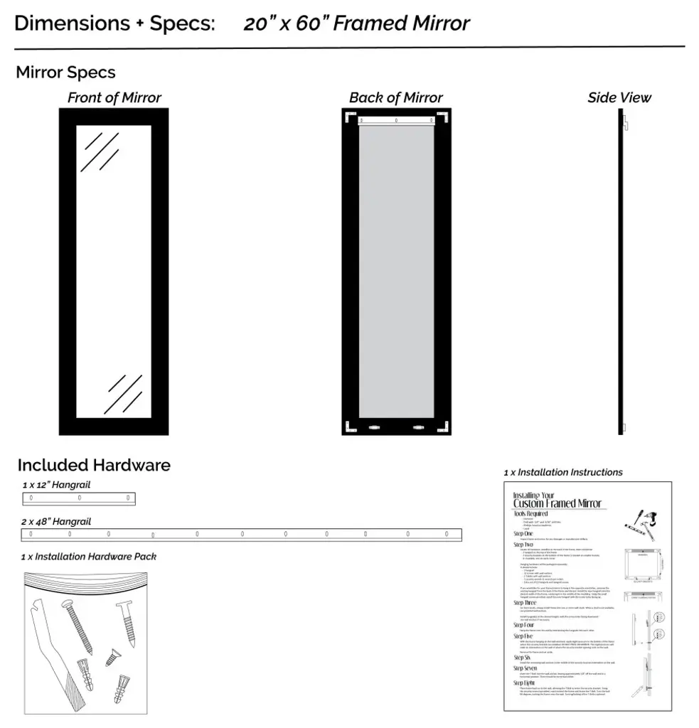 The wide, smooth surface of the Pendleton framed mirror is a great finishing touch for your space. With its contemporary style, the Pendleton is always a good choice.Hangrail for installation will be applied on the width of the frame. All assembly hardware and instructions will be included. Additional hangrails are included if the opposite orientation is desired for installation. The dimensions displayed are the final outside dimensions of the frame, including the mirror. CATII safety backing applied on all mirrors. Approved for high-moisture areas such as bathrooms.