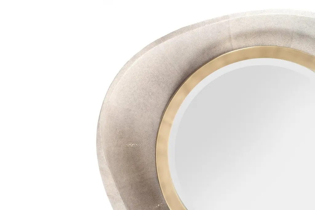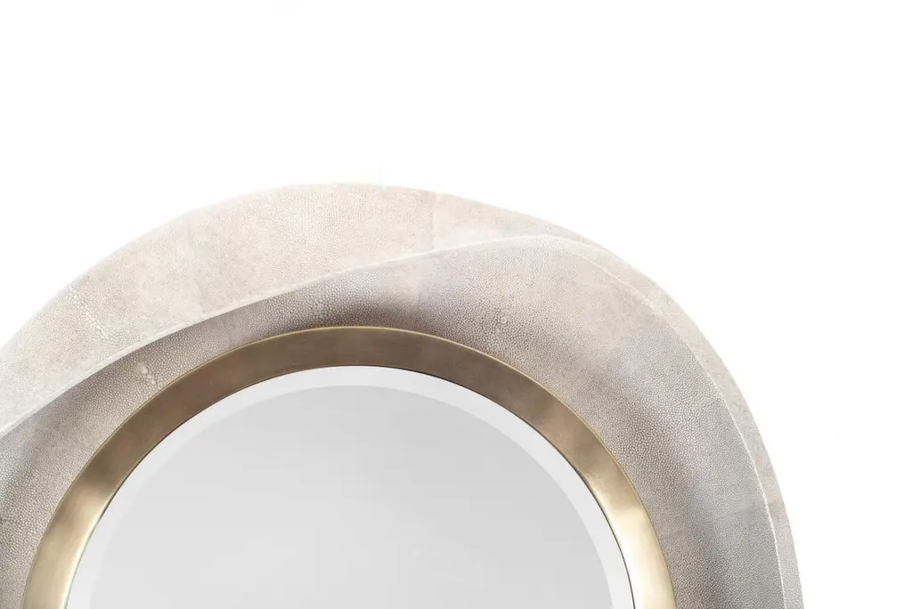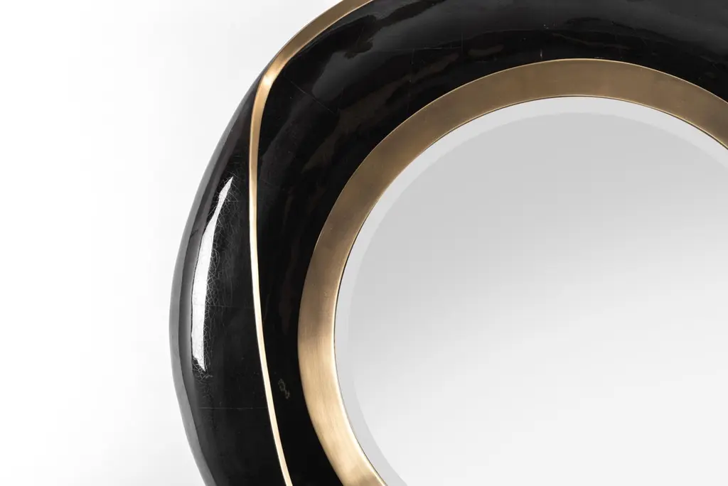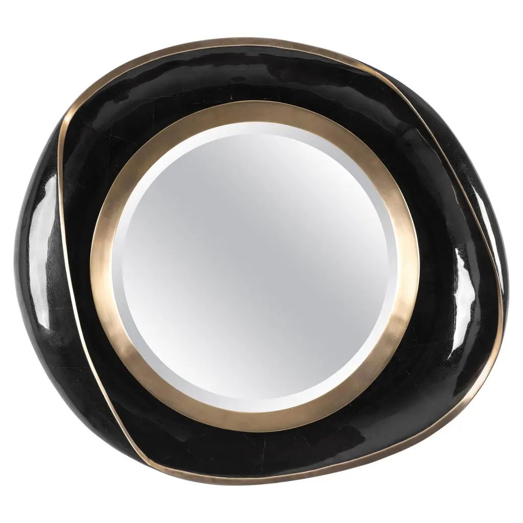 The Paris based label has distinguished themselves since their launch, with their iconic use of shagreen mixed with brass and other exotic materials. All furniture is handcrafted by skilled artisans, ultimately making each piece unique, designed in Paris and produced in the Philippines.The Petal Mirror in black pen shell and bronze-patina brass details is inspired by rose petals as they bloom. This is the perfect accent piece to dress up any wall with elegance and fantasy. A cream shagreen version is also available, see image at end of slide. Custom sizing/coloring available on request.The dimensions of this piece are 10 x 67 x 72 cm / 3.9" x 26.3" x 28.3"All R&Y Augousti pieces are handmade by artisans, ultimately making each piece unique. Wipe clean with soft dry cloth.Acclaimed design duo Ria & Yiouri Augousti have established themselves since the 1990’s as pioneers of modern-vintage style through their luxurious Art Deco inspired collections.The Paris based label has distinguished themselves since their launch, with their iconic use of shagreen mixed with brass and other exotic materials. All furniture is handcrafted by skilled artisans, ultimately making each piece unique. All shagreen-covered items should be kept out of direct sunlight, color variants may occur on the stingray and other exotic finishes, but this showcases the Parisian label's commitment to creating authentic luxurious products using natural components.