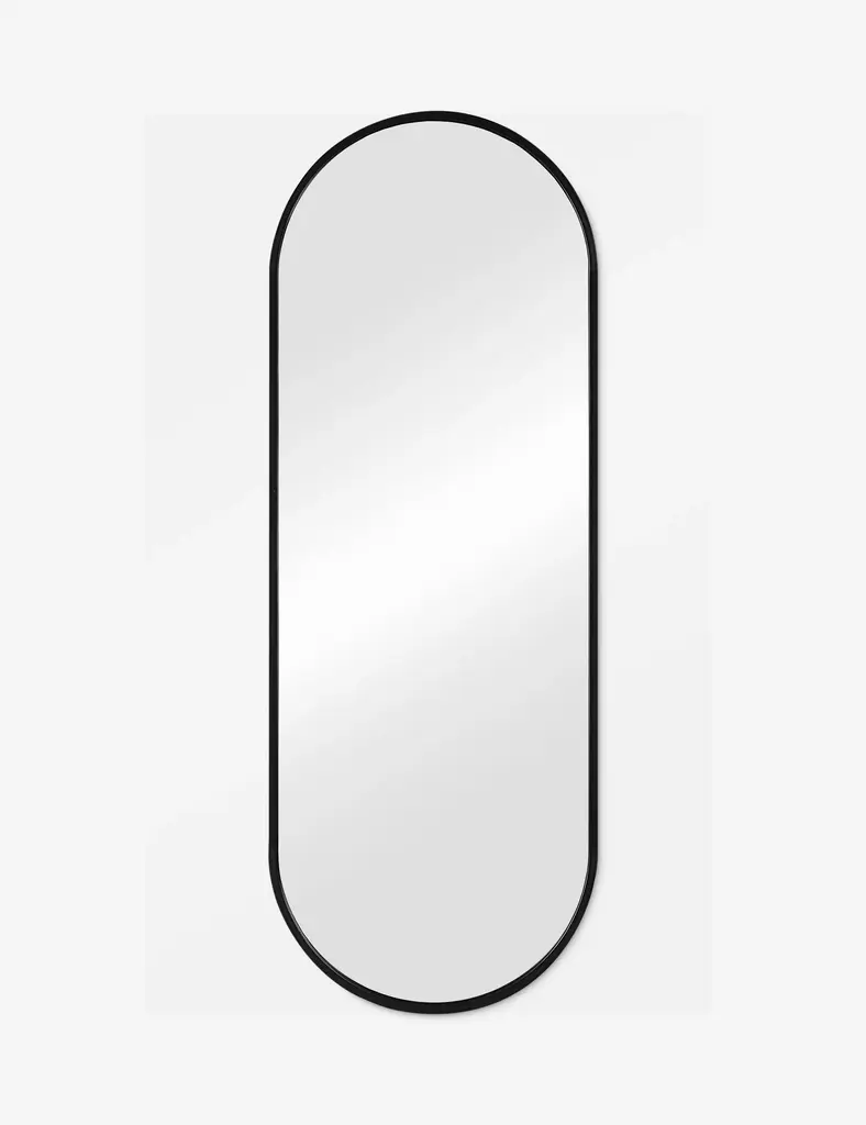 Bring a chic touch of drama to modern decor with a distinctive oval full-length wall mirror. Its soft silhouette completes a space with elegance, featuring a slender metal frame to create a sophisticated look in an entryway, bedroom, or bath.
