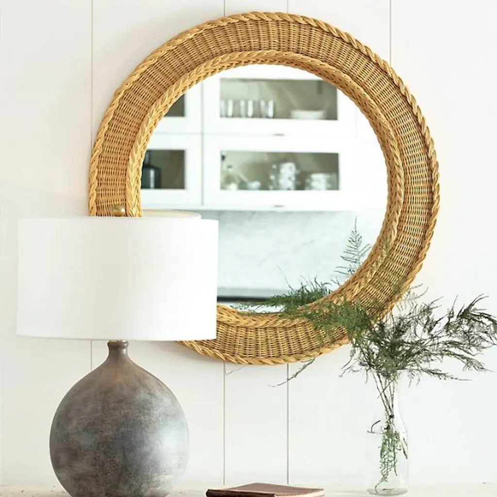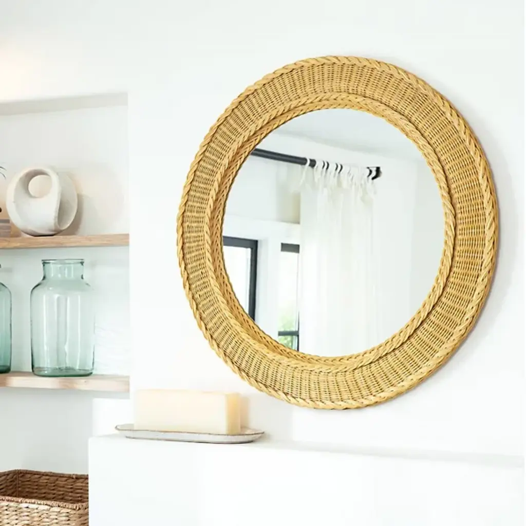 The Pierre Rattan Mirror by Regina Andrew offers coastal cottage charm and organic appeal in a beautiful round basket-weave frame. Its wheat-colored rattan seamlessly fits into traditional settings, making it versatile for bathrooms, powder rooms, entryways, or bedrooms. Infuse your decor with the warmth of natural beauty, courtesy of this stand-out piece.