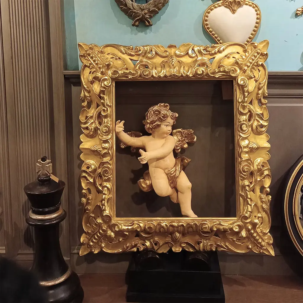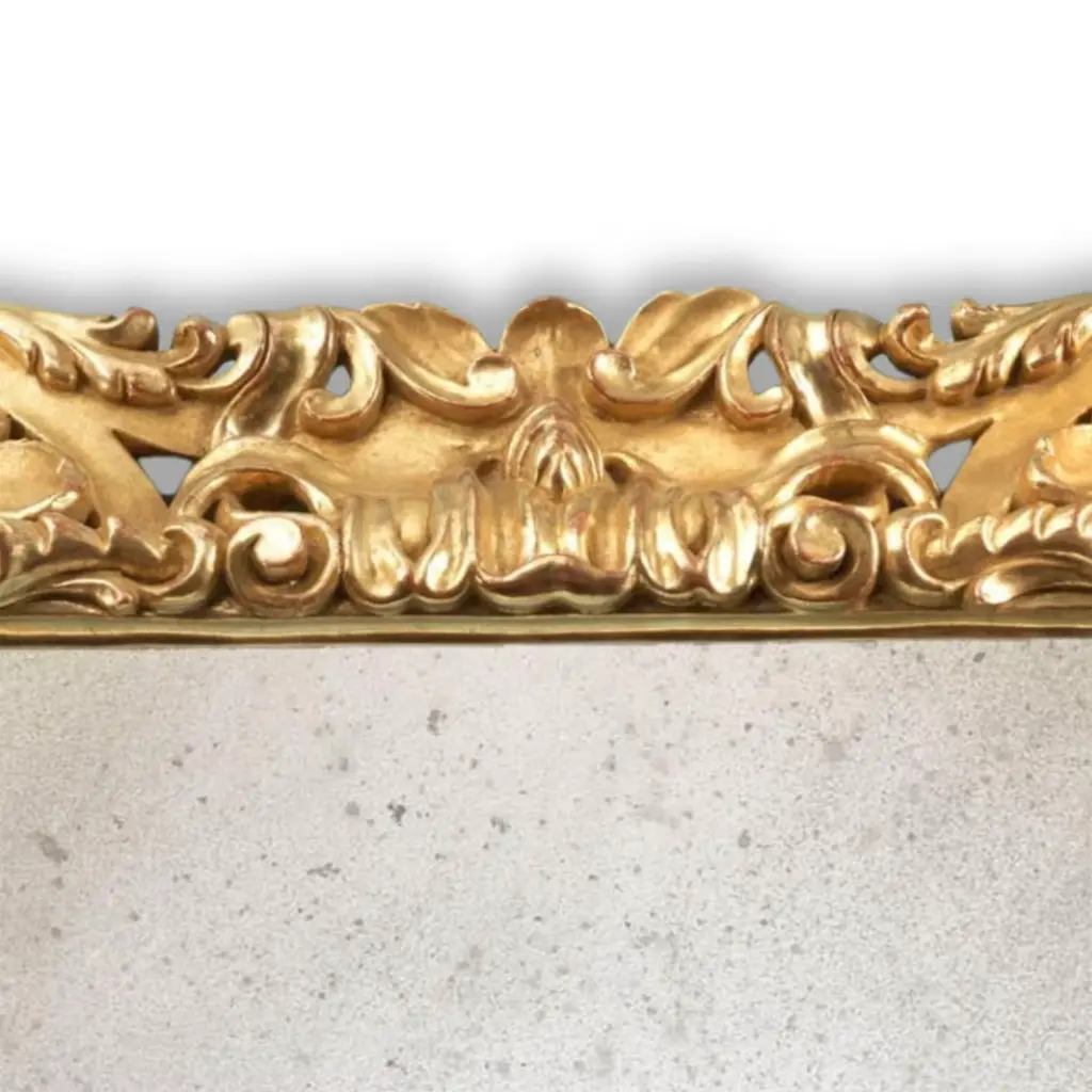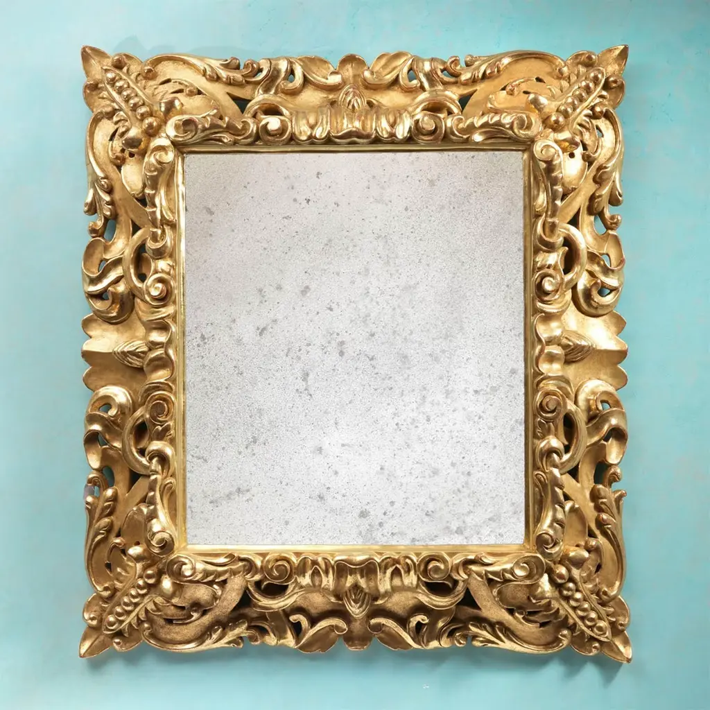 This antiqued mirror features a meticulously hand-carved rectangular frame inspired by the grandeur of the Renaissance. Drawing from an original frame from Pitti Palace in Florence, it embodies timeless elegance and sophisticated craftsmanship. The finish alternates glossy and bleary gold, with bleary gold enhancing depth, made with imitation gold leaf on a chalk and bole base, patinated with natural waxes and earth pigments. The frame includes a double hook for horizontal or vertical hanging.