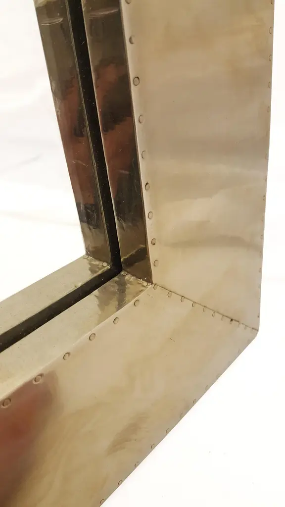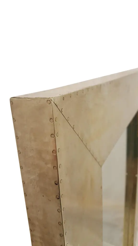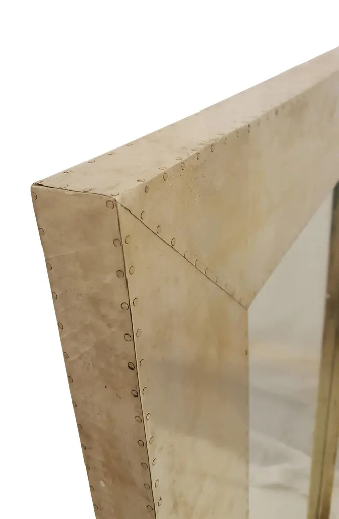 A simple rectangular mirror frame. The metal sheets are attached and covering the entire outside surface of the piece. The available options for metal cladding are brass, white bronze, antiqued bronze, silver and copper. Both silver and copper will tarnish over time. Regular non-abrasive household metal polishes can be used to restore the original finish. Plain Mirror Frame in White metalSize- 26” x 1” x 34” HMaterials - White metal, Teak, Hammered, Hand-CraftedPlease note that moisture in air, sudden change in temperature and natural movement of wood over time causes the metal to wrinkle or bubble up. We use well seasoned, reclaimed teak and high quality marine grade MDF (wherever technically possible) to avoid and delay the above mentioned changes. However a perfect stability of metal cannot be guaranteed.Buyer Cancellation-The cancellation charge is 25% which increases to 50% if the production is started.Prices do not include shipping from India (for custom orders) or our MN warehouse (items from stock). That will be additional.