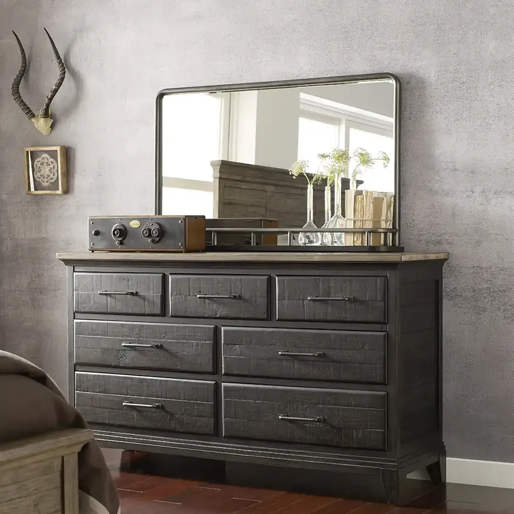 Elevate your bedroom's rustic appeal with the Westwood Landscape Mirror from the Plank Road Collection. This striking piece masterfully blends form and function, designed to complement without overpowering. The mirror's frame, crafted from sleek metal tubing, adds an industrial touch that contrasts beautifully with the warmth of genuine New Zealand Pine. A thoughtful addition of a wooden tray along the front provides a practical space for displaying treasured trinkets or everyday essentials. This mirror's unique design allows it to correlate seamlessly with other pieces in the collection while maintaining its own distinct character. Crafted with solid wood construction, the Westwood Landscape Mirror stands as a testament to quality and style, promising to be a cherished focal point in your space for years to come.