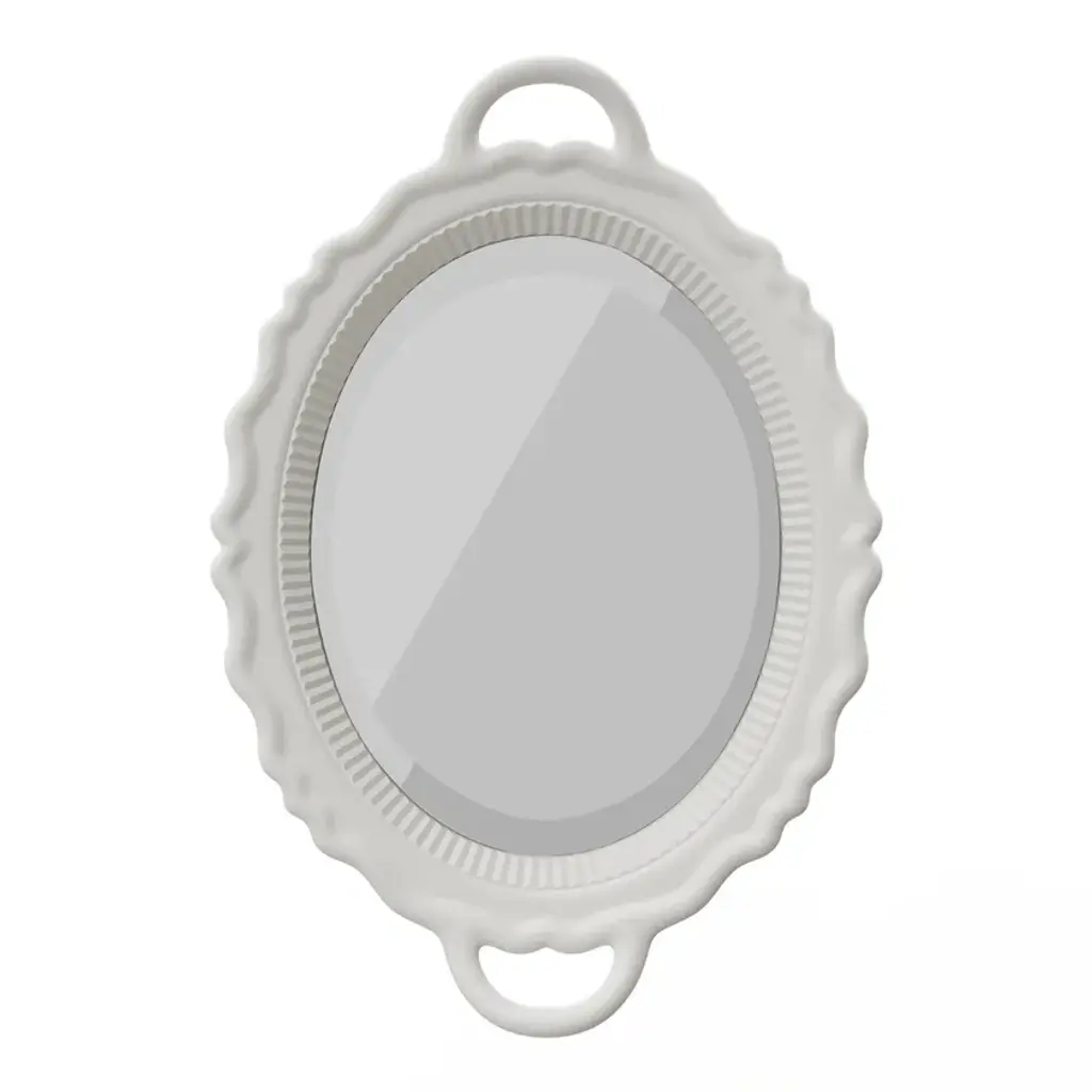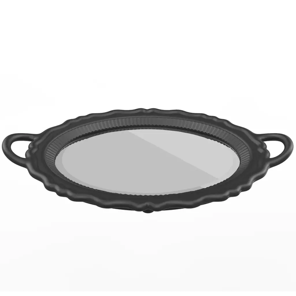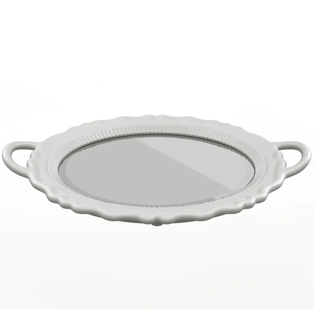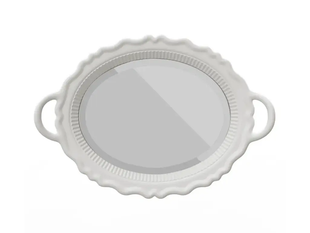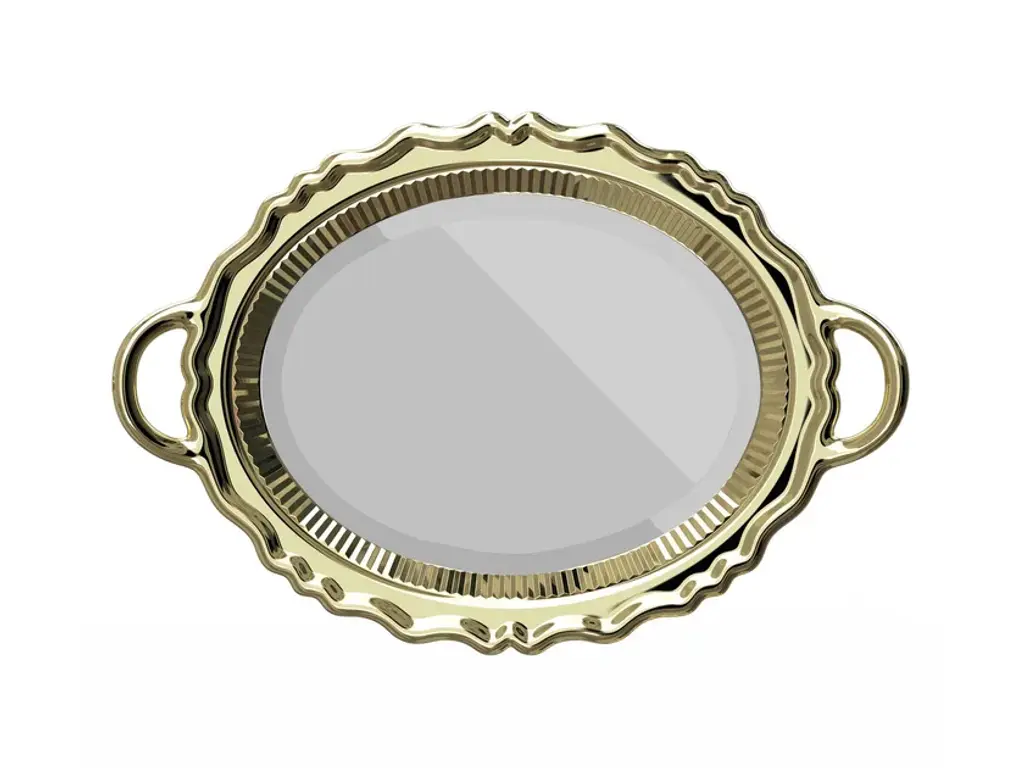 “A precious 17th century silver tray, historically used as a status symbol, revives as a plastic rotation moulded mirror. Although Miroir can be seen as 21st century silverware, the quality, cra smanship and detailing is still as re ned as ever before.” – Job SmeetsMIROIR - Oval framed mirror designed by Studio Job.Dimensions: 110 x 76,5 x h 10,5 cm Weight: 4,5 kg Materials: PE-Polyethylene Colors: gold, silver, white, black