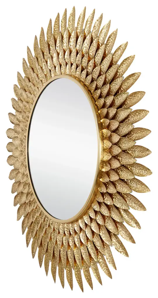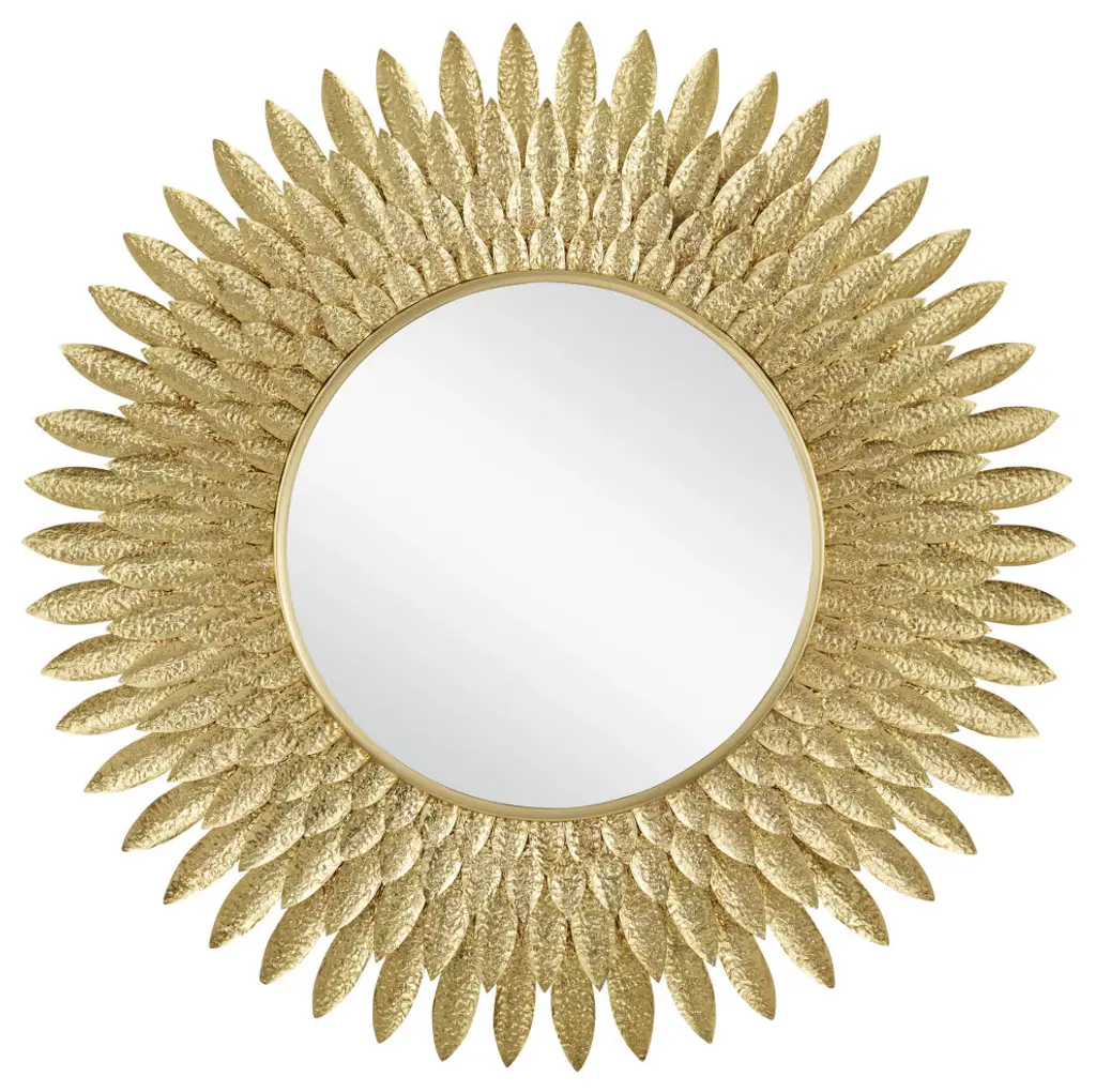 A beautiful burst of brass feathers, the Plume Round Mirror is a remarkably artistic creation, with each of the hundreds of hand-cut and hand-hammered faux feathers affixed to the frame one after another by artisan hand. The rows graduate from largest to the smallest as they move toward the mirrored glass.
