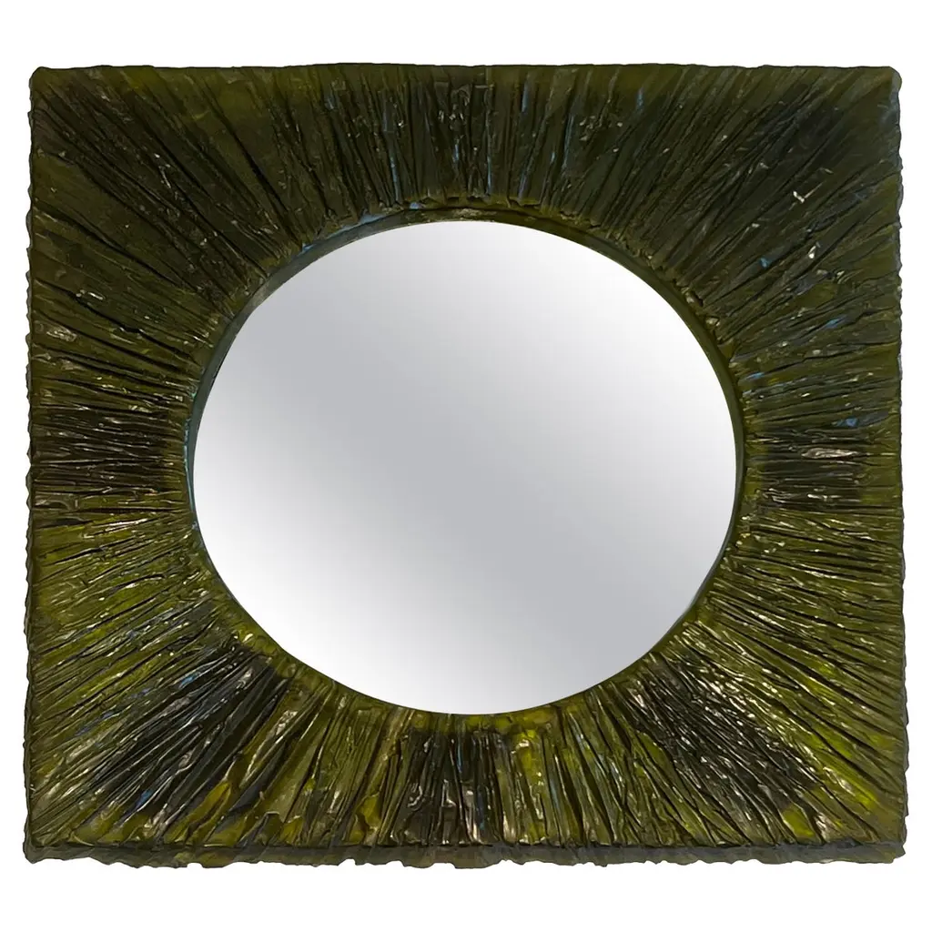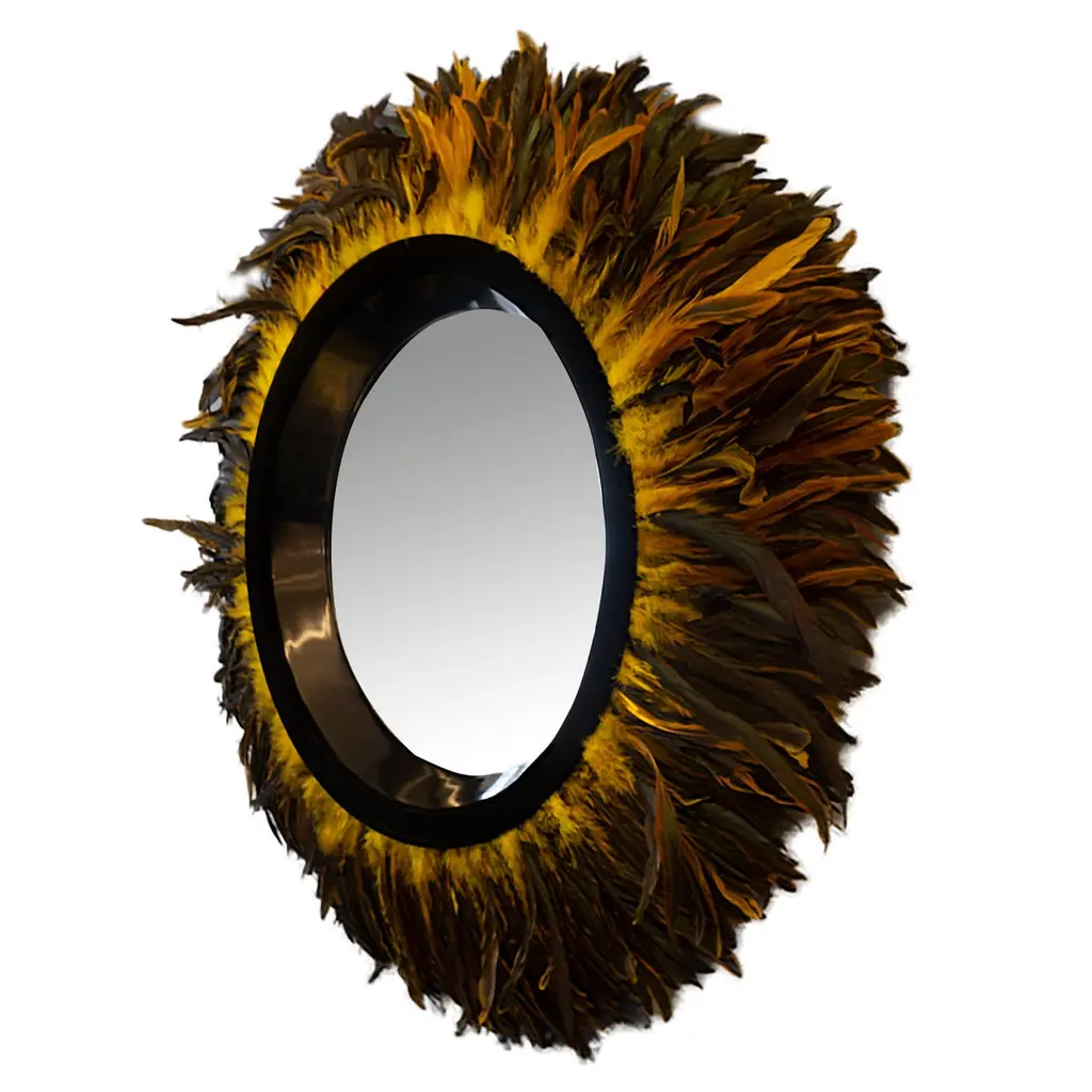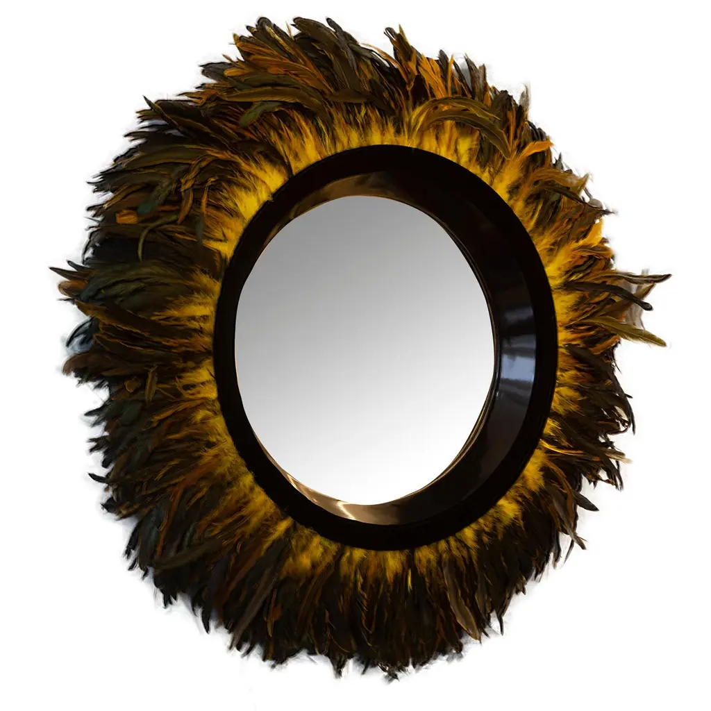 This modern statement mirror was handcrafted at our studio in Norwalk, Connecticut. It features a trim made of gold or bronze Coque feathers. Measurements: 35” diameter.