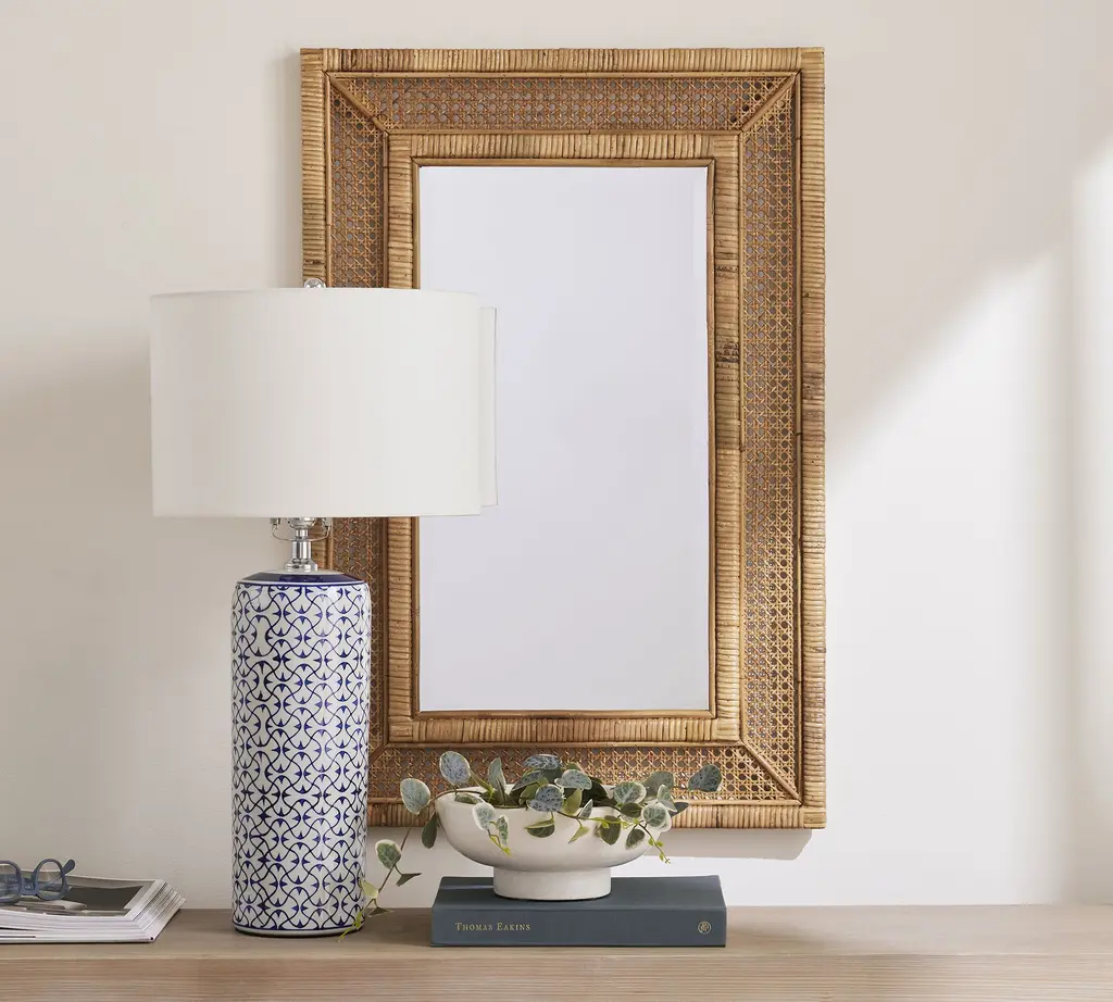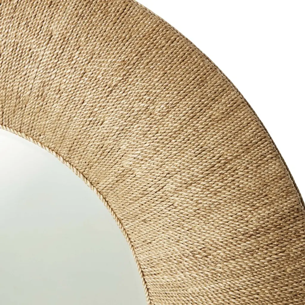 The rich texture and tones of natural abaca imbue our Point Reyes mirror with organic beauty and coastal style. Handwoven in a marquetry-inspired pattern, the fibers are wrapped around a mahogany frame and finished with a semigloss lacquer to lend the mirror a gentle radiance.