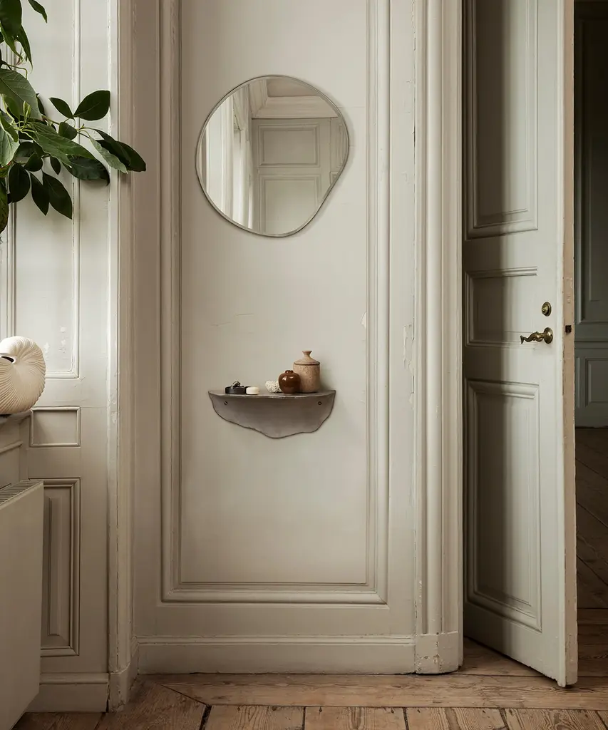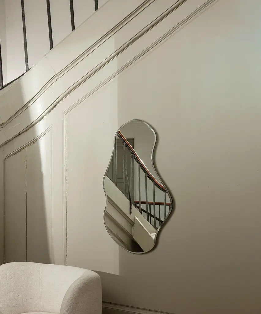 Inspired by free-flowing movements of water, the Pond Mirrors invite open and fluid forms into your home, turning the functional mirror into a decorative wall piece. Featuring two unique forms in different sizes, the Pond series features organic shapes formed by a simple metal frame. The mirror can be hung in multiple orientations, allowing you to find the perfect fit for your home. Designed and produced by the Copenhagen-based studio Ferm Living.