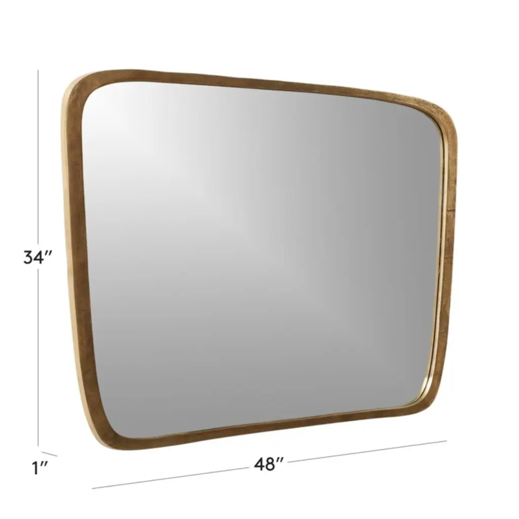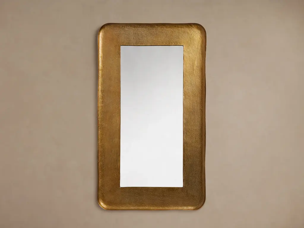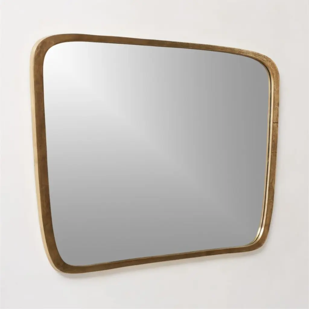 Ideal above a dresser or in the bathroom, wall mirror features an organic shape and substantial edge. Brass finish on cast aluminum frame looks equally at home in an urban loft as it does in a country home getaway, making it a versatile piece for any room in the home. CB2 exclusive.Due to the nature of the material, brass patina will vary in color and darken over time.