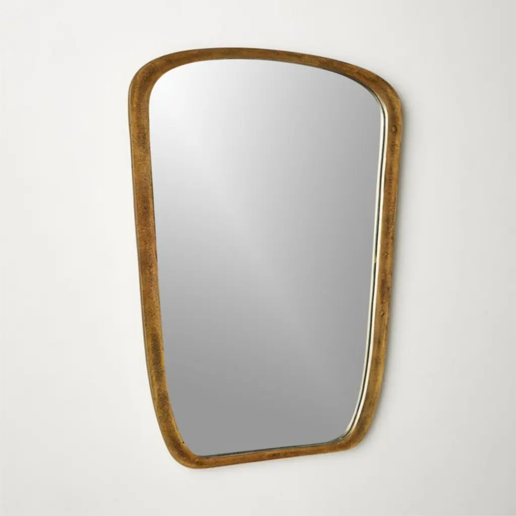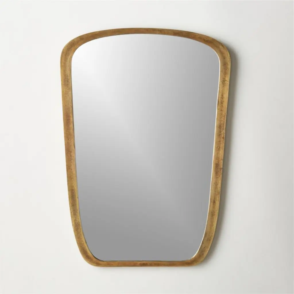 Ideal above a dresser or in the bathroom, wall mirror features an organic shape and substantial edge. Brass finish on cast aluminum frame looks equally at home in an urban loft as it does in a country home getaway, making it a versatile piece for any room in the home. CB2 exclusive.