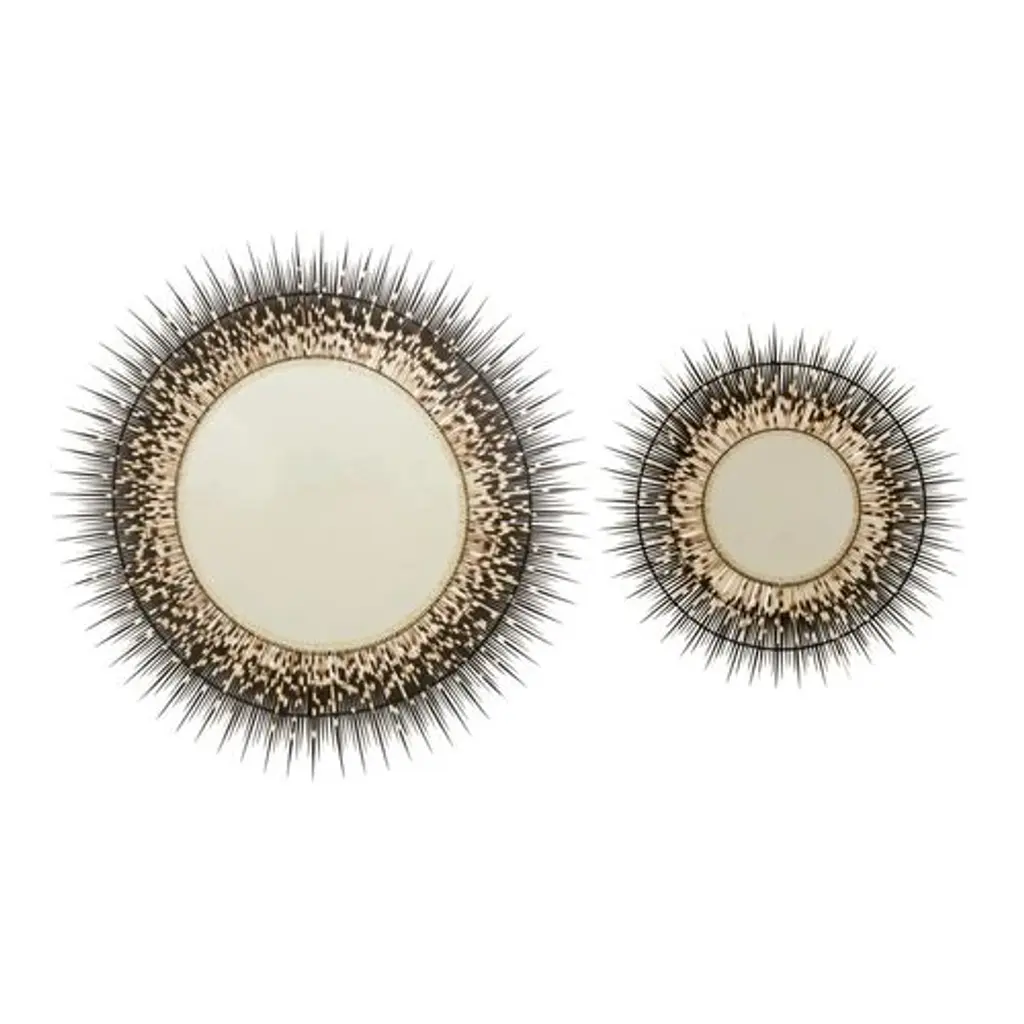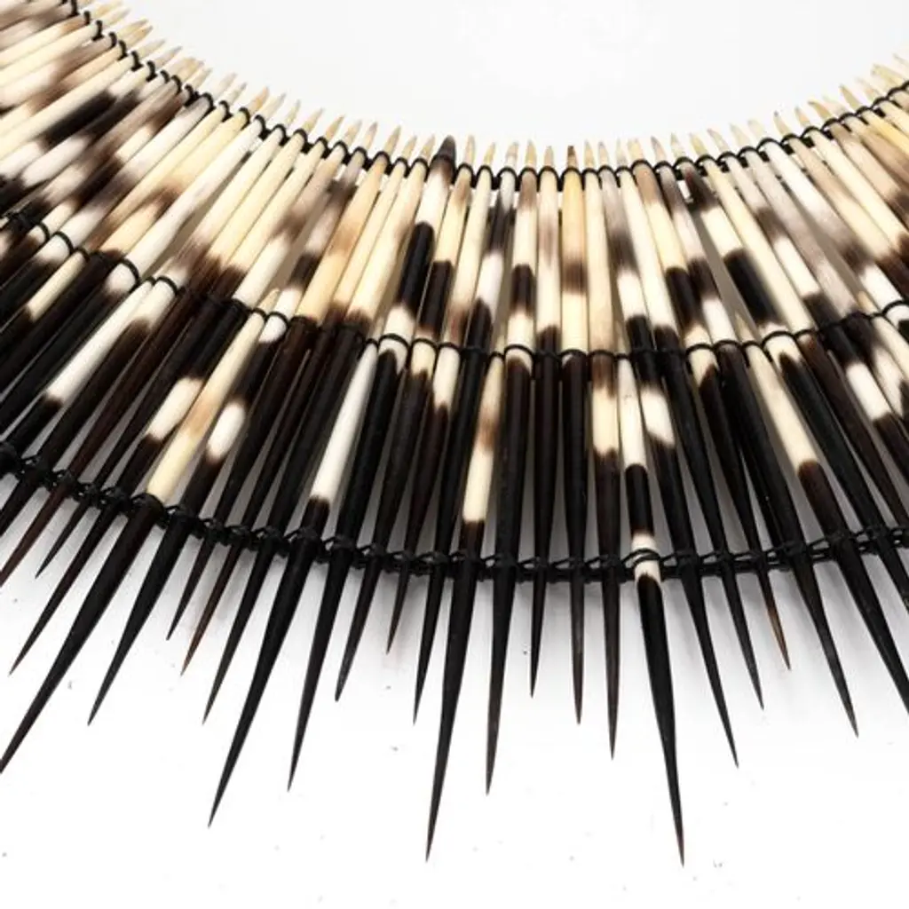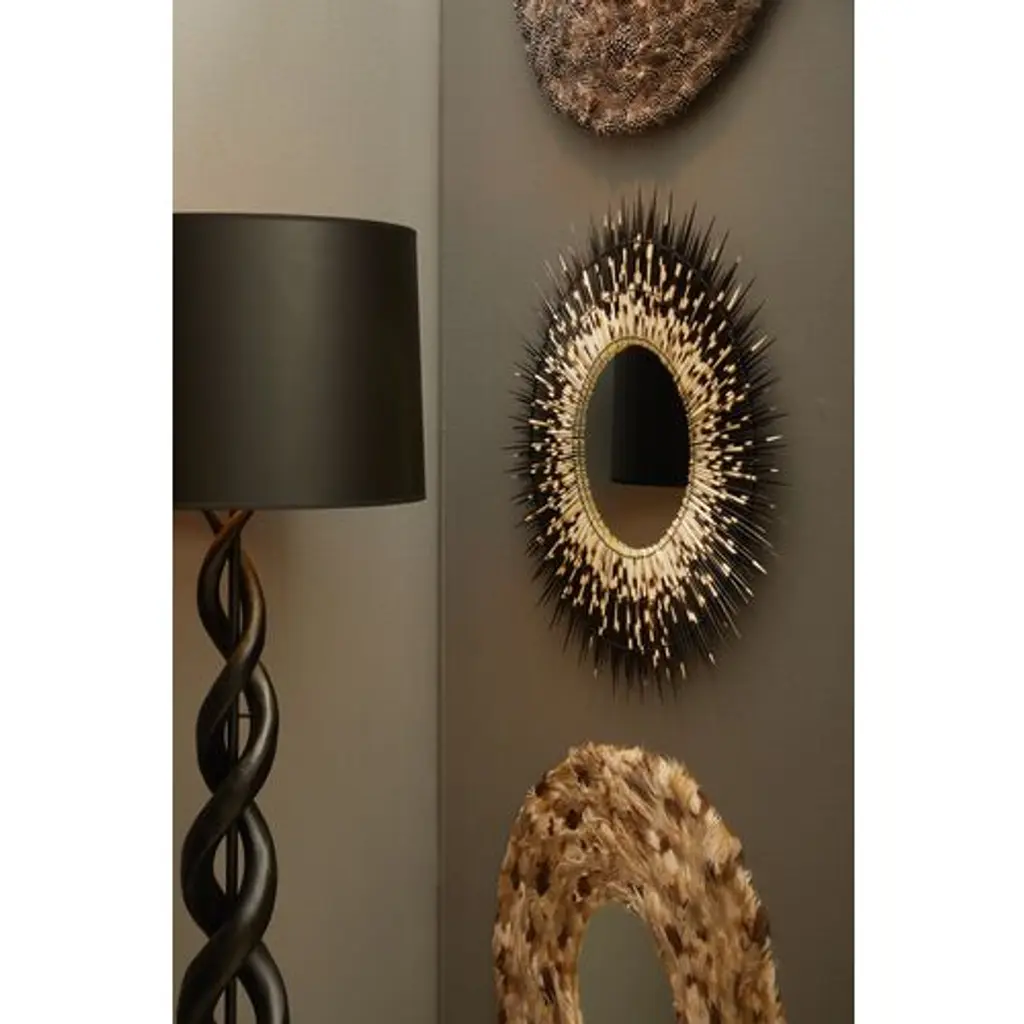 This organic interpretation of the classic sunburst mirror has a frame handcrafted of naturally shed porcupine quills collected on a farm in Cape Town, South Africa. It's as much a work of art and a conversation piece as it is a functional addition to a wall. Due to the nature of the materials, no two mirrors are exactly alike.