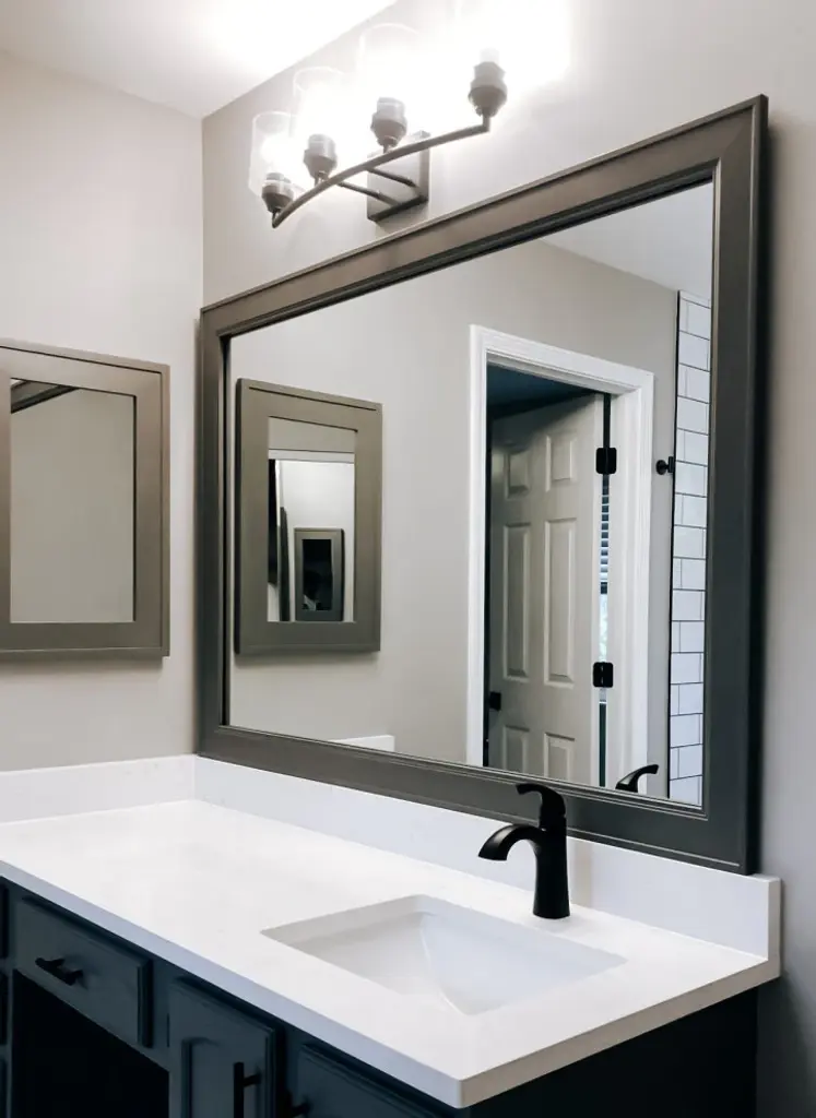 Clean lines give the Porter collection a classic look. Available in black, white, silver and dark gray, this shaker-style collection can match just about any decor or style.Hangrail for installation will be applied on the width of the frame. All assembly hardware and instructions will be included. Additional hangrails are included if the opposite orientation is desired for installation. The dimensions displayed are the final outside dimensions of the frame, including the mirror. CATII safety backing applied on all mirrors. Approved for high-moisture areas such as bathrooms.