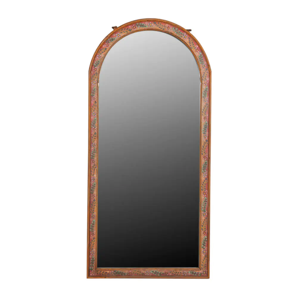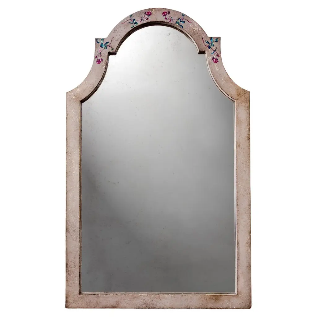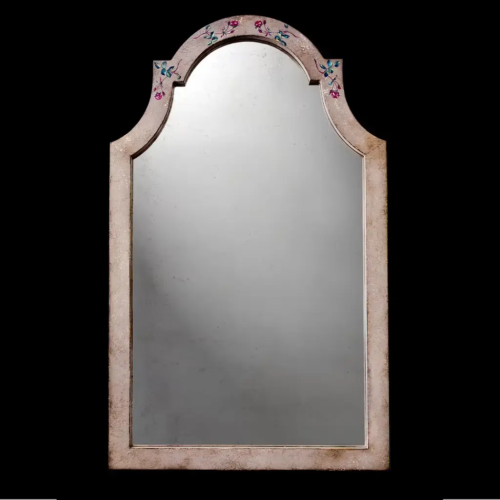 The secret, romantic appeal of this antiqued mirror will soften any corner in a modern or traditional home. The handcrafted wooden frame, painted in pastel pink, features a rectangular profile interrupted at the top by two concave elements flanking a domed one adorned with delightful, hand-painted flowers. The piece can be customized in all of its components including a clear variant for the mirrored glass, please inquire with the Concierge for details.