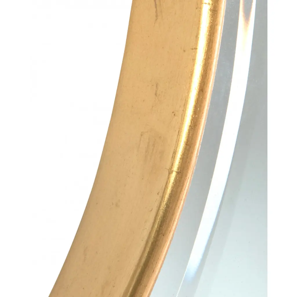 28"W X 42"H X 2"D A simple frame in gold with reverse-scalloped corners surrounds a clear, modern beveled mirror. This mirror can hang vertically or horizontally.