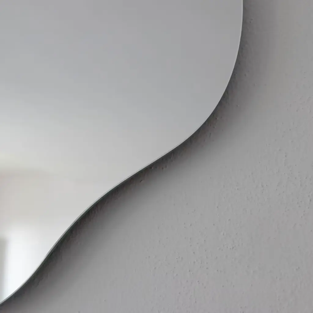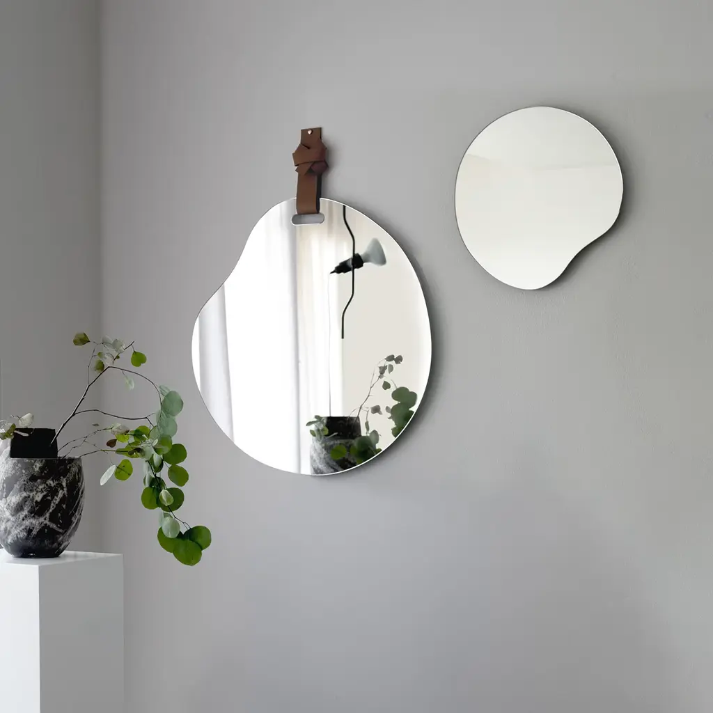 The Puddle small mirror features an organic, fluid shape inspired by the irregular form of water puddles. This decorative element adds a natural, artistic touch to interior spaces. Available in three sizes, the small model pairs well with the regular size to create a dynamic visual effect. Its unique silhouette and smooth surface provide both functionality and a subtle statement in home décor.