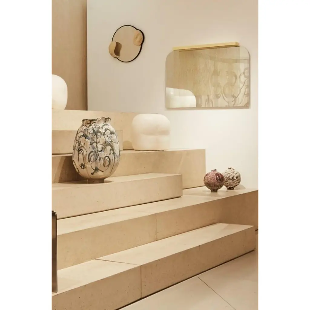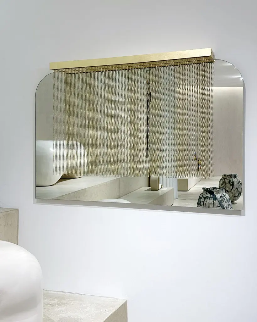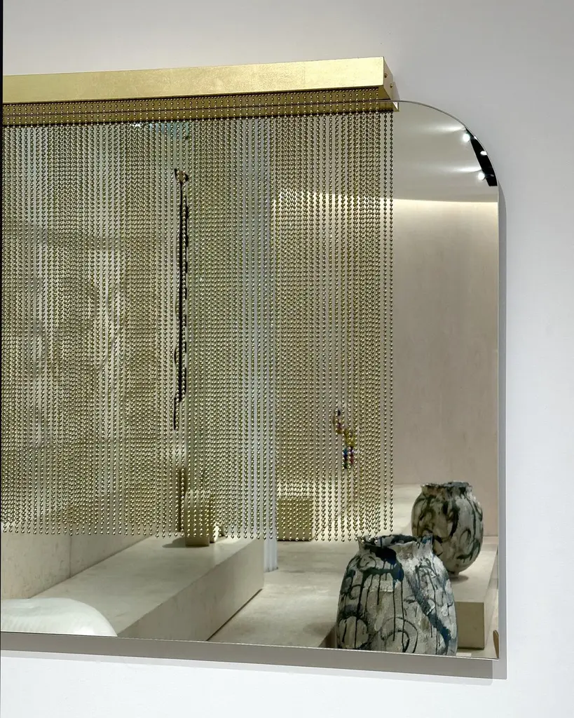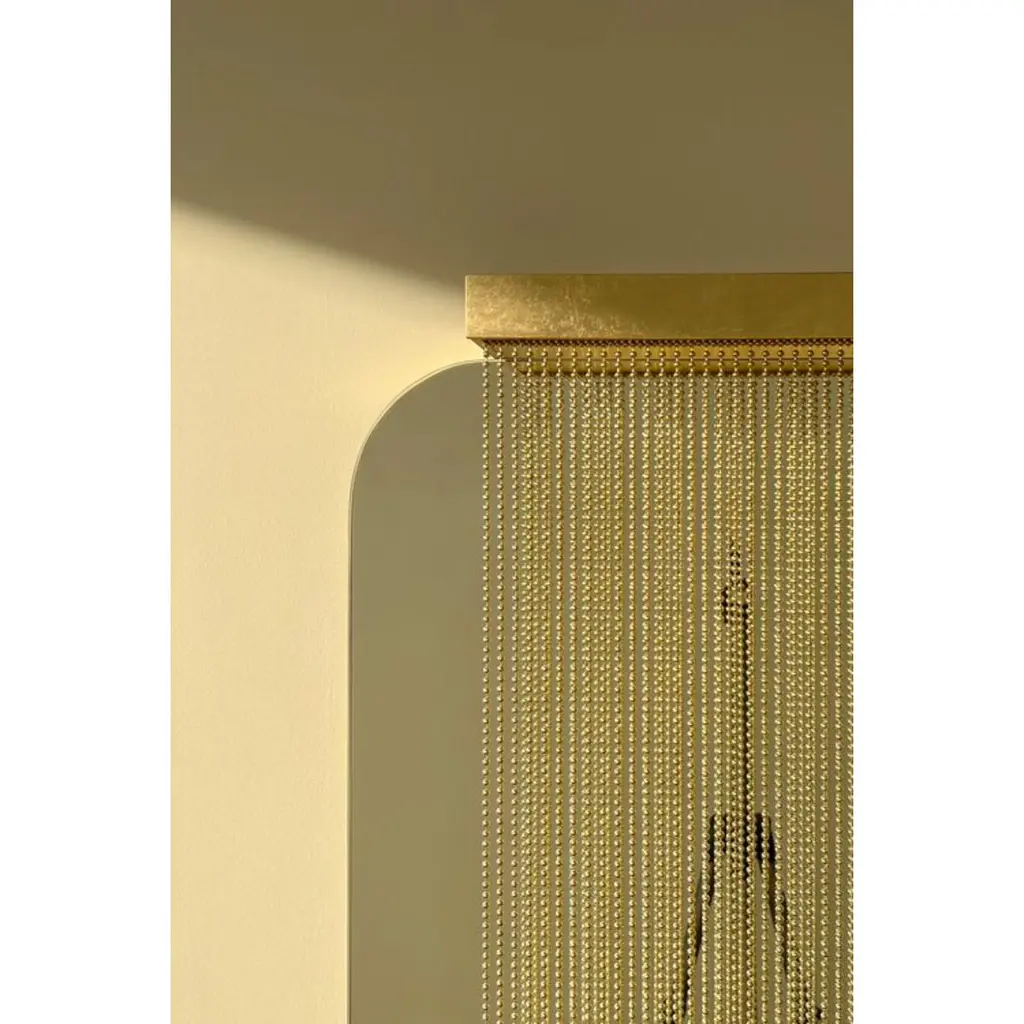 Purdah Large Mirror by INDO-Dimensions: D 10.2 x W 121.9 x H 76.2 cm.Materials: Satin brass, mirrored glass and gold leaf.Each piece is carefully handcrafted by our team using natural materials and traditional processes. Slight variations may occur. Please contact us.Referencing the silhouette of palace windows from which women viewed public processions, the Purdah Mirror invites you to experience the elegance and charm of a bygone era, while seamlessly blending tradition with contemporary aesthetics.A brass veil hangs from a gilded bar to create a soft, hazy reflection, adding an element of mystery and wonder to the space it resides in. Available in two sizes, the Full Length and Wall Mirror and three metal finishes, Purdah is perfect for hallways, dining rooms or above a mantle. INDO- is an award-winning interdisciplinary design studio based in Providence, RI. Founded in 2018 by Urvi Sharma and Manan Narang - both grew up in New Delhi and met at the Rhode Island School of Design - INDO- is a product of experiencing both places and cultures. Using a blend of craft and narrative in our creative process, we aim to share the rich cultural and historical identity we bring with us as Indian designers in the rapidly changing landscape of American design. With a focus on re-contextualizing traditional techniques from different disciplines of art and craft into our work, INDO- creates contemporary objects that celebrate the handmade and acknowledge the people and places that inspired them.