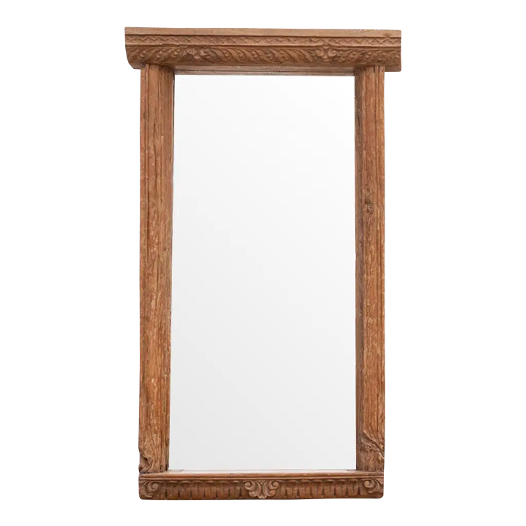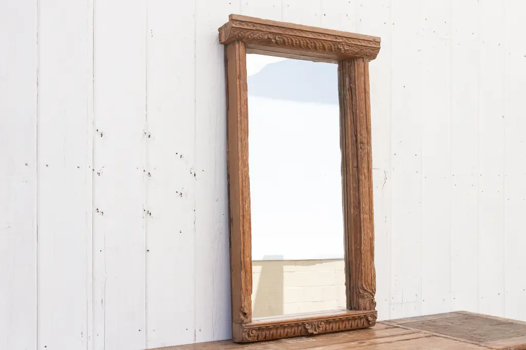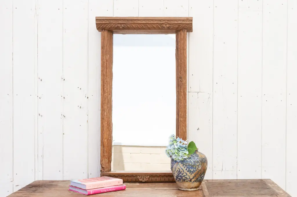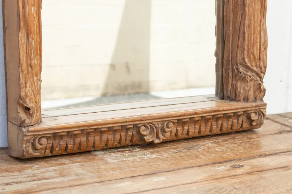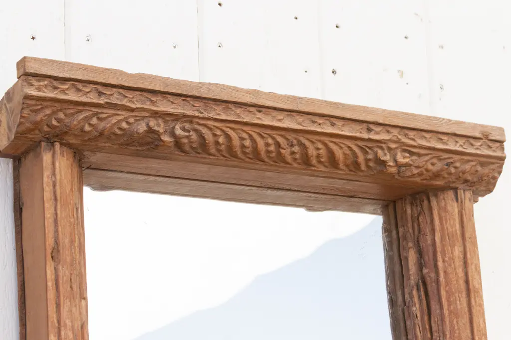 This extraordinary mirror is framed by a 19th-century teak window from a haveli in Rajasthan, India. Originally gracing the window of a majestic mansion, this piece carries the essence of its rich heritage. The frame showcases meticulously carved filigree and geometric motifs by skilled artisans. Its original patina finish, gently worn with the passage of time, adds a touch of character and authenticity. The mirror's age wear serves as a testament to its longevity and storied past.