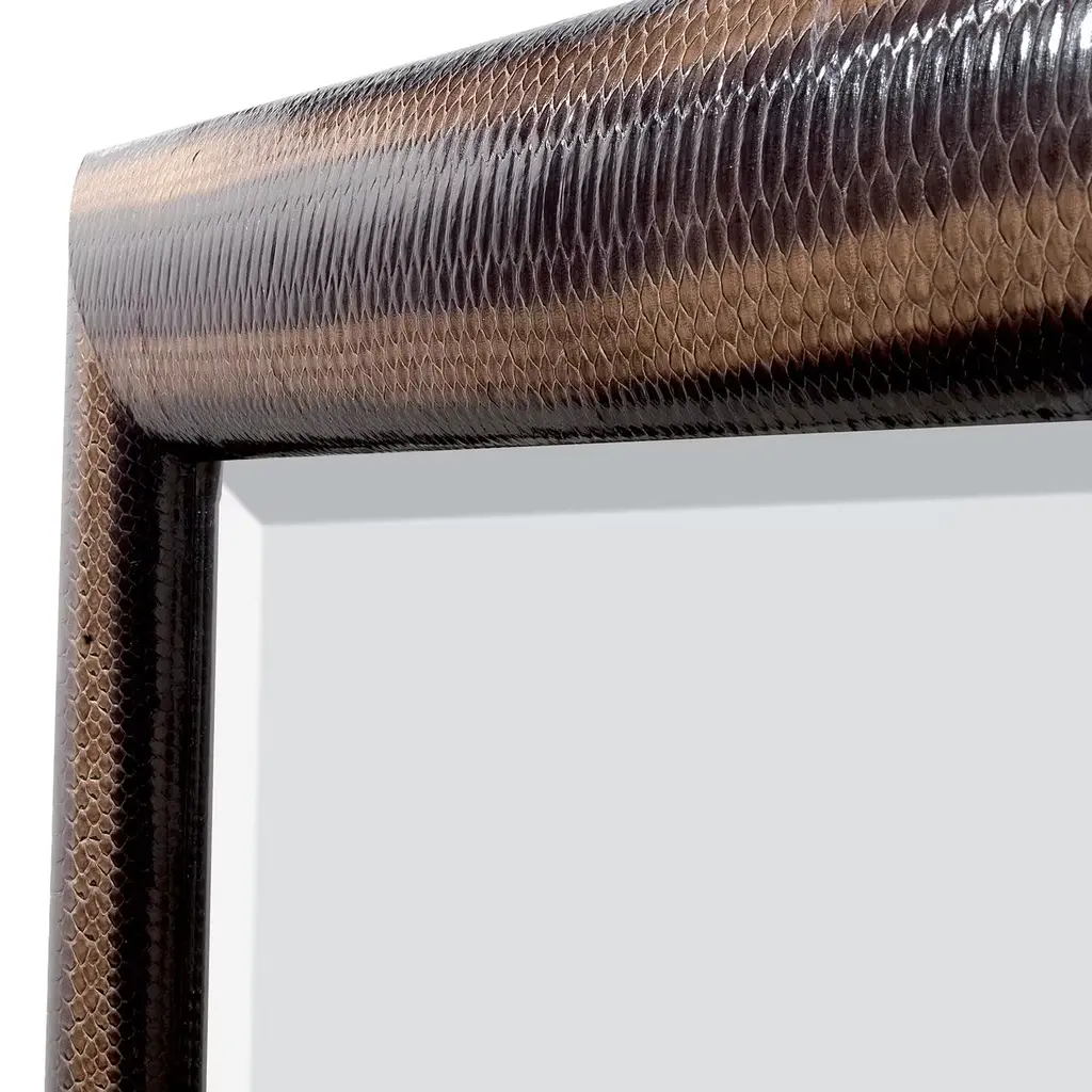 Part of the Python collection, featuring striking mirrors whose elegant frames are upholstered in genuine python leather, this piece features a wooden structure and back. The mirror, with minimalist moldings at the edges, is enclosed in a stunning frame covered in a dark shade of python, whose one-of-a-kind patterns run alongside the perimeter of the piece, creating a unique texture with rich dark and light browns. A superb addition to both a classic and a contemporary decor, this piece will be eye-catching in any room in the house.