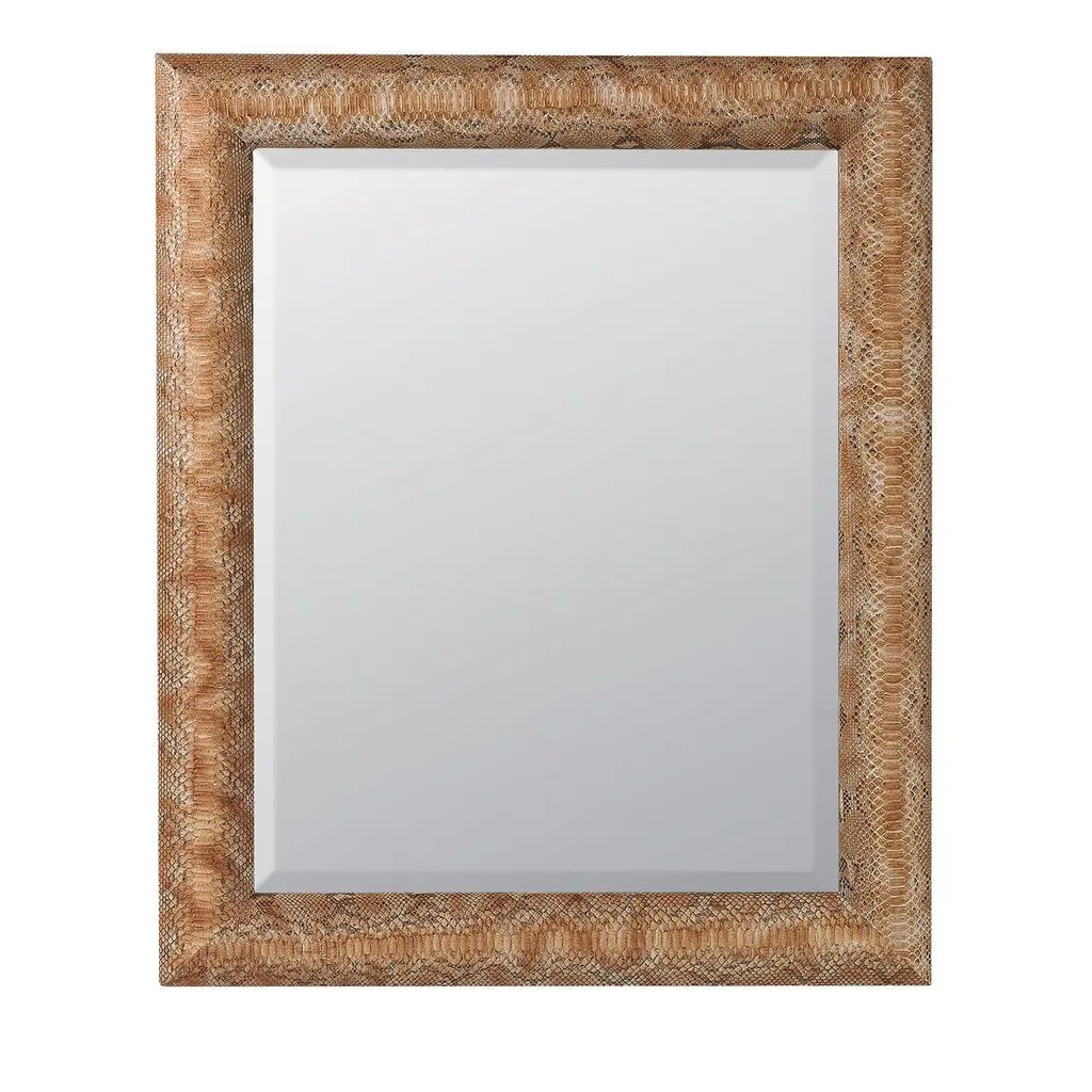 An exquisite piece of functional decor, this mirror is a stunning addition to a contemporary or eclectic interior, where it will add a decorative accent on any wall. The mirror features a simple molding at the edges and is enclosed in a wooden frame in a simple rectangular shape, covered with a genuine python leather, whose one-of-a-kind patterns and delicate colors create a unique decoration. A stunning piece that will complement an entryway, bedroom or living room, this piece can be made in custom sizes upon request - please ask the Concierge.