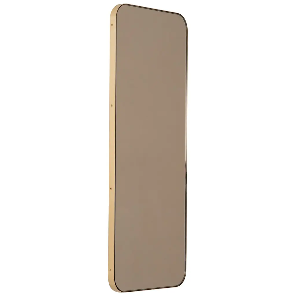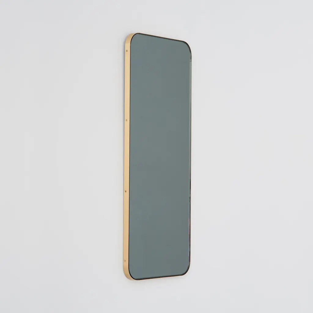 Modern black tinted Quadris™ rectangular mirror with a minimalist solid brushed brass frame. Designed and handcrafted in London, UK. Our mirrors are designed with an integrated French cleat (split batten) system that ensures the mirror is securely mounted flush with the wall. An alternative hanging hook or a Z-bar (depending on the size of the mirror) is available on demand for mirrors that need to be installed allowing some separation from the wall.This mirror is fully customisable.The mirror in the images illustrates a small size, measuring 27cm x 68cm x 1.8cm / 10.6in x 26.8in x 0.71inShipped safely and insured worldwide. All our mirrors are made on demand. Fabrication lead time for this mirror is approximately 4 to 5 weeks. Our mirrors are always shipped by courier express. Shipping via courier express typically requires 1 to 2 days to the UK, or 2 to 7 days outside the UK depending on the destination.Available in the following sizes:Small: 27cm x 68cm x 1.8cm / 10.6'' x 26.8'' x 0.71’’Medium: 37cm x 56cm x 1.8cm / 14.6'' x 22" x 0.71’’Large: 46cm x 71cm x 1.8cm / 18.1'' x 28" x 0.71’’Extra Large: 48cm x 97cm x 1.8cm / 18.9" x 38.2" x 0.71’’or any bespoke dimensions.Available options:- frame depth: 18mm / 0.71’’, 24mm / 0.94’’ and 30mm / 1.18’’- frame finish: brass (brushed, polished or with a bronze patina), copper, stainless steel, blackened stainless steel, or in a variety of colours- mirror tint: silver, bronze, black, rose gold / peach, blue or green- bevelling- back-illumination creating a halo effect- demister padPlease contact us for a quote for any bespoke specification or added options.ORDERS OF MULTIPLE MIRRORS OF THE SAME TYPE: Please contact us to receive a Packing and Shipping quote when ordering multiple mirrors of the same type. An order for multiple mirrors of the same type may not be accepted without extra packing and shipping fees. Thank you.