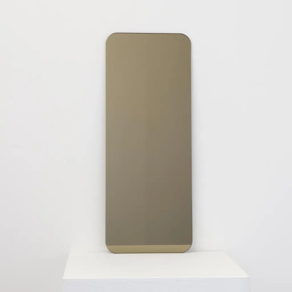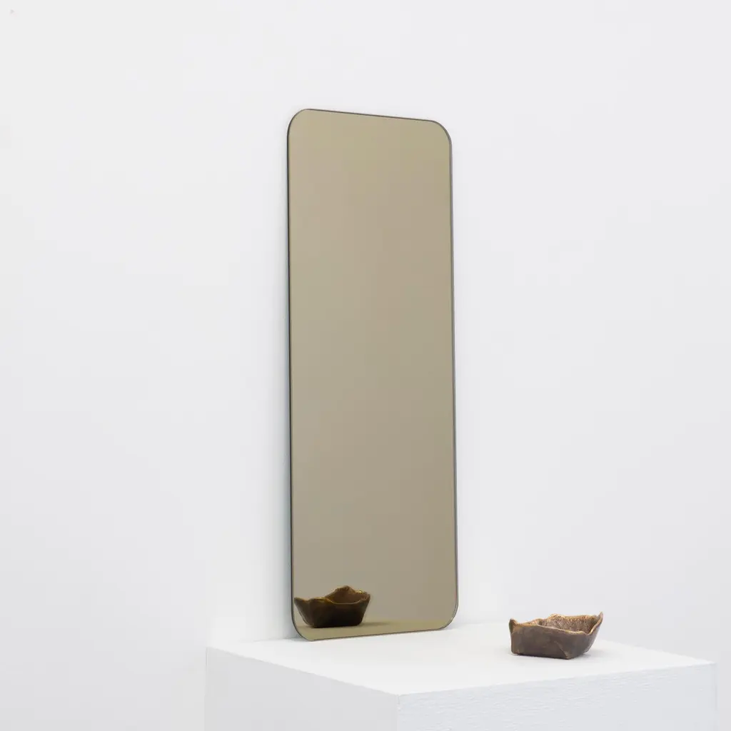 Minimalist Quadris™ rectangular shaped frameless bronze tinted mirror with a floating effect. Quality design that ensures the mirror sits perfectly parallel to the wall. Designed and made in London, UK.Fitted with professional plates not visible once installed for an easy and safe installation. Lined at the back with a quality protective film. Supplied with all accessories, including screws and wall plugs.This mirror is fully customisable. Shipped safely worldwide.The images show a small size, measuring 27cm x 68cm x 0.6cm / 26.8'' x 10.6'' x 0.24’’.Note that the standard hanging position for this mirror is vertical. If you wish for the mirror to be hanged horizontally, please let our team know and we may adapt the hanging system accordingly.ORDERS OF MULTIPLE MIRRORS OF THE SAME TYPE: Please contact us to receive a Packing and Shipping quote when ordering multiple mirrors of the same type. An order for multiple mirrors of the same type may not be accepted without extra packing and shipping fees. Thank you.
