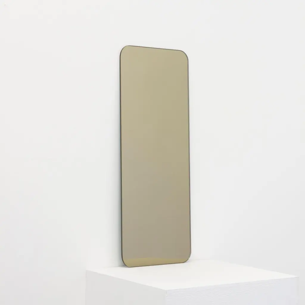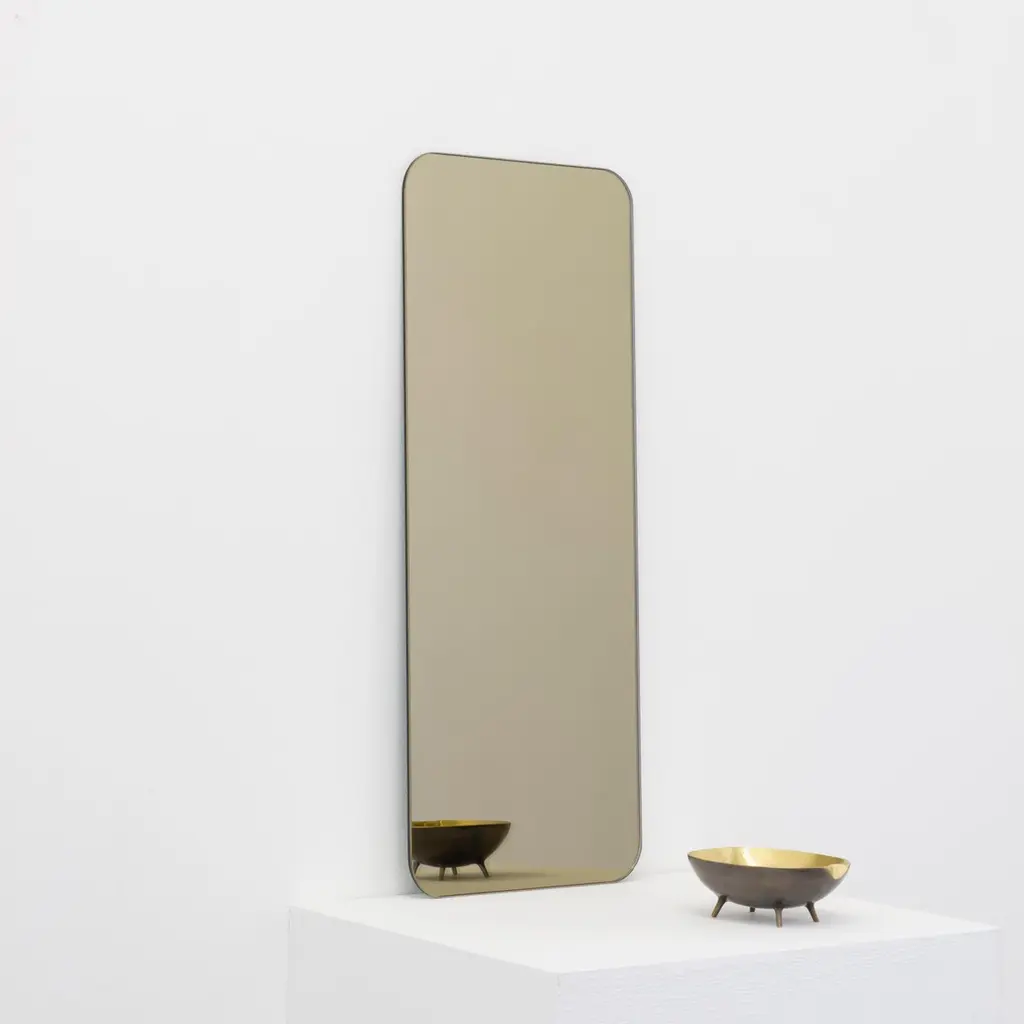 Minimalist Quadris™ rectangular shaped frameless bronze tinted mirror with a floating effect. Quality design that ensures the mirror sits perfectly parallel to the wall. Designed and made in London, UK.Fitted with professional plates not visible once installed for an easy and safe installation. Lined at the back with a quality safety film. Supplied with all accessories, including screws and wall plugs.This mirror is fully customisable. Shipped safely worldwide.The images show a small size, measuring 27cm x 68cm x 0.6cm / 26.8'' x 10.6'' x 0.24’’.Note that the standard hanging position for this mirror is vertical. If you wish for the mirror to be hanged horizontally, please let our team know and we may adapt the hanging system accordingly.ORDERS OF MULTIPLE MIRRORS OF THE SAME TYPE: Please contact us to receive a Packing and Shipping quote when ordering multiple mirrors of the same type. An order for multiple mirrors of the same type may not be accepted without extra packing and shipping fees. Thank you.