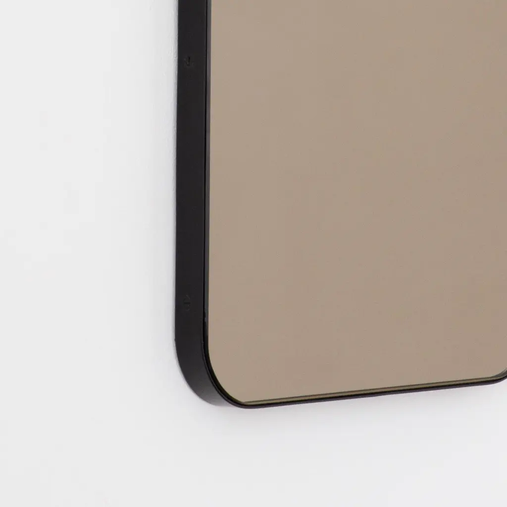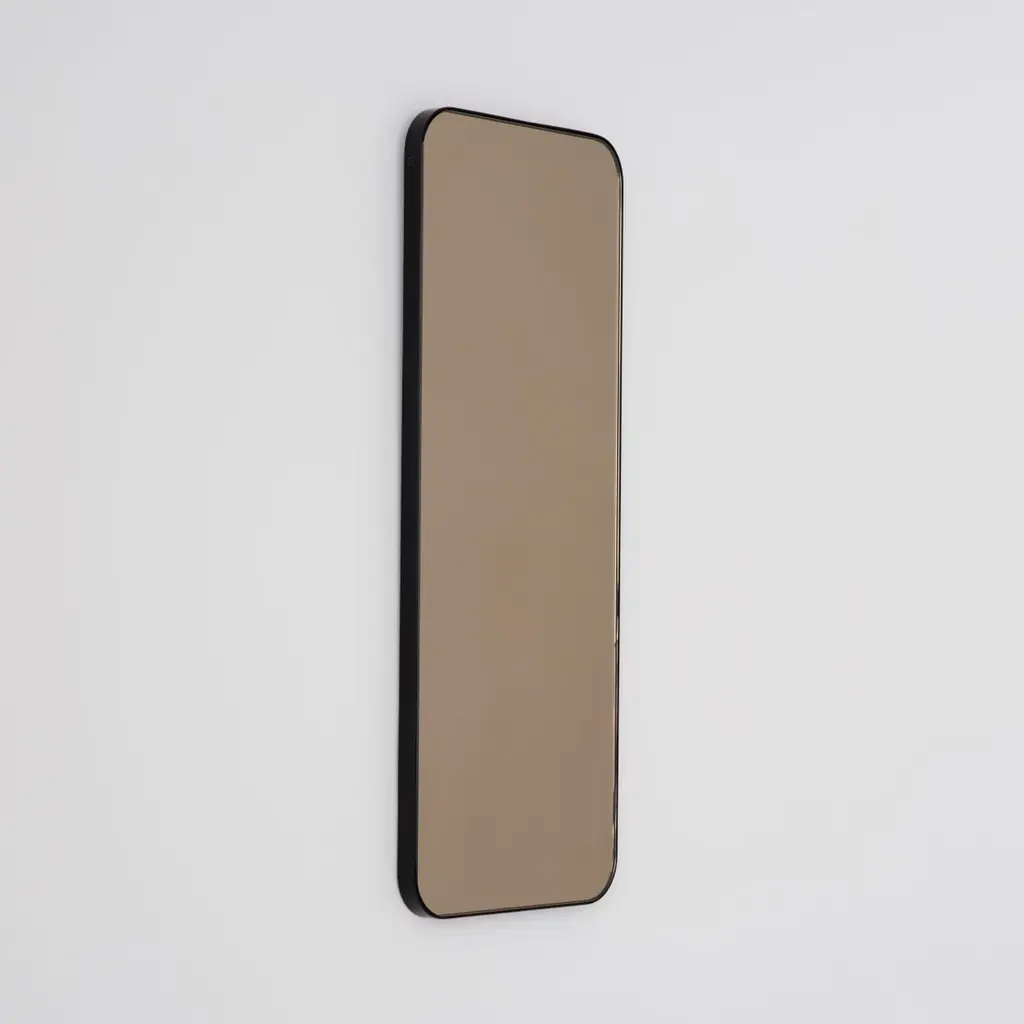 Contemporary bronze tinted Quadris™rectangular mirror with an elegant black frame. Designed and handcrafted in London, UK. Our mirrors are designed with an integrated French cleat (split batten) system that ensures the mirror is securely mounted flush with the wall. An alternative hanging hook or a Z-bar (depending on the size of the mirror) is available on demand for mirrors that need to be installed allowing some separation from the wall.This mirror is fully customisable.The mirror in the images illustrates a small size, measuring 27cm x 68cm x 1.8cm / 10.6in x 26.8in x 0.71inShipped safely and insured worldwide. All our mirrors are made on demand. Fabrication lead time for this mirror is approximately 4 to 5 weeks. Our mirrors are always shipped by courier express. Shipping via courier express typically requires 1 to 2 days to the UK, or 2 to 7 days outside the UK depending on the destination.Available in the following sizes:Small: 27cm x 68cm x 1.8cm / 10.6'' x 26.8'' x 0.71’’Medium: 37cm x 56cm x 1.8cm / 14.6'' x 22" x 0.71’’Large: 46cm x 71cm x 1.8cm / 18.1'' x 28" x 0.71’’Extra Large: 48cm x 97cm x 1.8cm / 18.9" x 38.2" x 0.71’’or any bespoke dimensions.Available options:- frame depth: 18mm / 0.71’’, 24mm / 0.94’’ and 30mm / 1.18’’- frame finish: brass (brushed, polished or with a bronze patina), copper, stainless steel, blackened stainless steel, or in a variety of colours- mirror tint: silver, bronze, black, rose gold / peach, blue or green- bevelling- back-illumination creating a halo effect- demister padPlease contact us for a quote for any bespoke specification or added options.ORDERS OF MULTIPLE MIRRORS OF THE SAME TYPE: Please contact us to receive a Packing and Shipping quote when ordering multiple mirrors of the same type. An order for multiple mirrors of the same type may not be accepted without extra packing and shipping fees. Thank you.