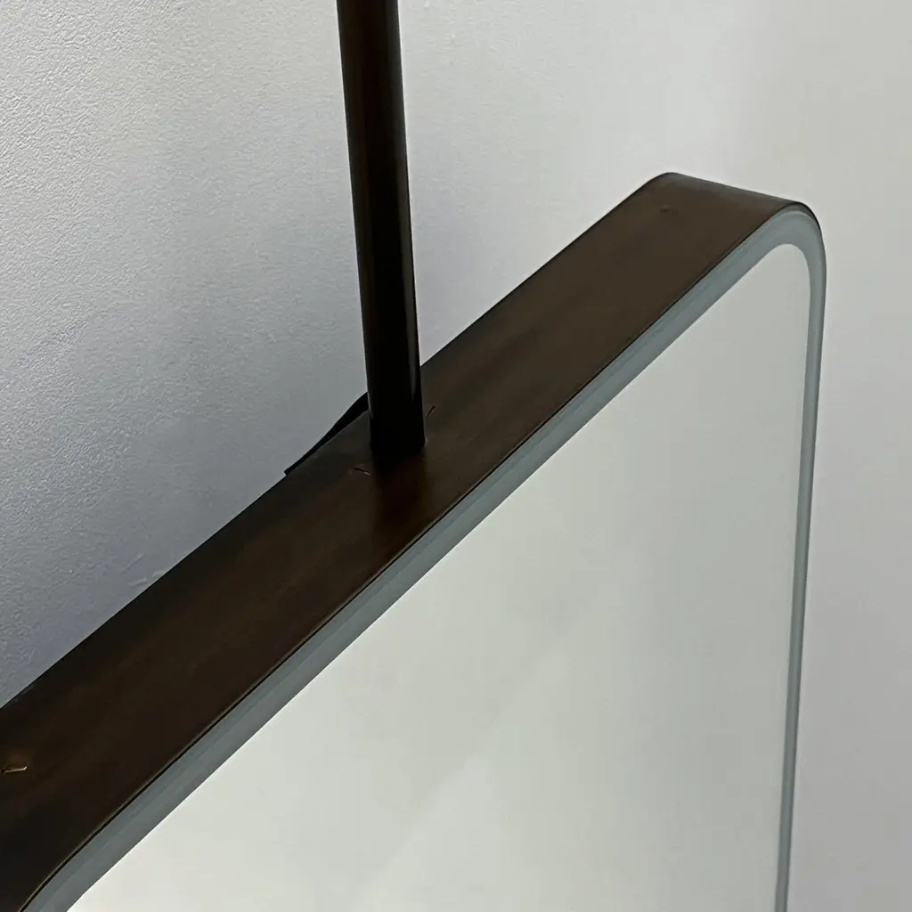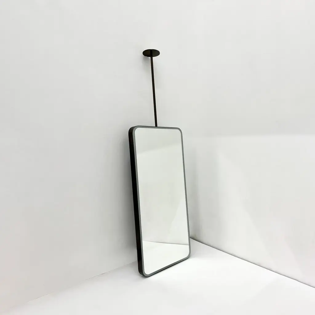 Modern ceiling suspended Quadris™ rectangular mirror with front illumination and an exquisite and handcrafted brass frame with bronze patina finish. Designed and handcrafted in London, UK. This mirror is fully customisable to suit the specific requirements of each interior.Mirror backing. The high quality finish of our countertop mirrors extends to their backings, which are made from a powder coated panel available in black or white. Backings can also be upgraded to a finish that matches the frame or can be substituted by a second mirror, making your mirror double sided.Cover plate. The ceiling plate is supplied with a cover hiding the screws to complete the minimalist design of the mirror.The Neska™ signature bronze patina finish of our frames is a highly skilled and handcrafted process. Carried out by our talented craftsmen, this artistic finish is created from the base metal itself to achieve the natural look of aged brass. This makes the finish of each frame original and unique as no two frames can be identical. Any sample or images provided to obtain your approval on the desired finish or on our website or any other promotional material are therefore for guidance only.Shipped safely and insured worldwide. All our mirrors are made on demand. Fabrication lead time for this mirror is approximately 6 to 7 weeks. Our mirrors are always shipped by courier express. Shipping via courier express typically requires 1 to 2 days to the UK, or 2 to 7 days outside the UK depending on the destination.Dimensions (customisable): 81.2cm x 36.8cm x 4.1cm (Drop 43.1cm) / 31.97in x 14.49in x 1.61in (Drop 17in)Mirror drop: Customisable – Price may be adjusted if drop greater than the height of the mirror. Please contact us for further information.All dimensions and frame finish may be customised to create a very unique piece that bridges the mirror's timeless design with a contemporary finish.Available options:- frame finishes: brass (brushed, polished or with a bronze patina), copper, stainless steel, blackened metal, powder coated aluminium in a range of standard or bespoke colours- full frame- backing with a finish that matches the frame- double-sided mirror- mirror tints: standard silver, black, bronze, blue, rose gold / peach- back-illumination creating a halo effect- ON/OFF sensor switch- dimmable driver- demister pad- bevelPlease contact us for a quote for any bespoke specification or added options.IMPORTANT NOTES:This suspended mirror is intended to be mounted onto the ceiling and cannot be installed onto a countertop. Countertop mounted mirrors are available on demand.ORDERS OF MULTIPLE MIRRORS OF THE SAME TYPE: Please contact us to receive a Packing and Shipping quote when ordering multiple mirrors of the same type. An order for multiple mirrors of the same type may not be accepted without extra packing and shipping fees. Thank you.
