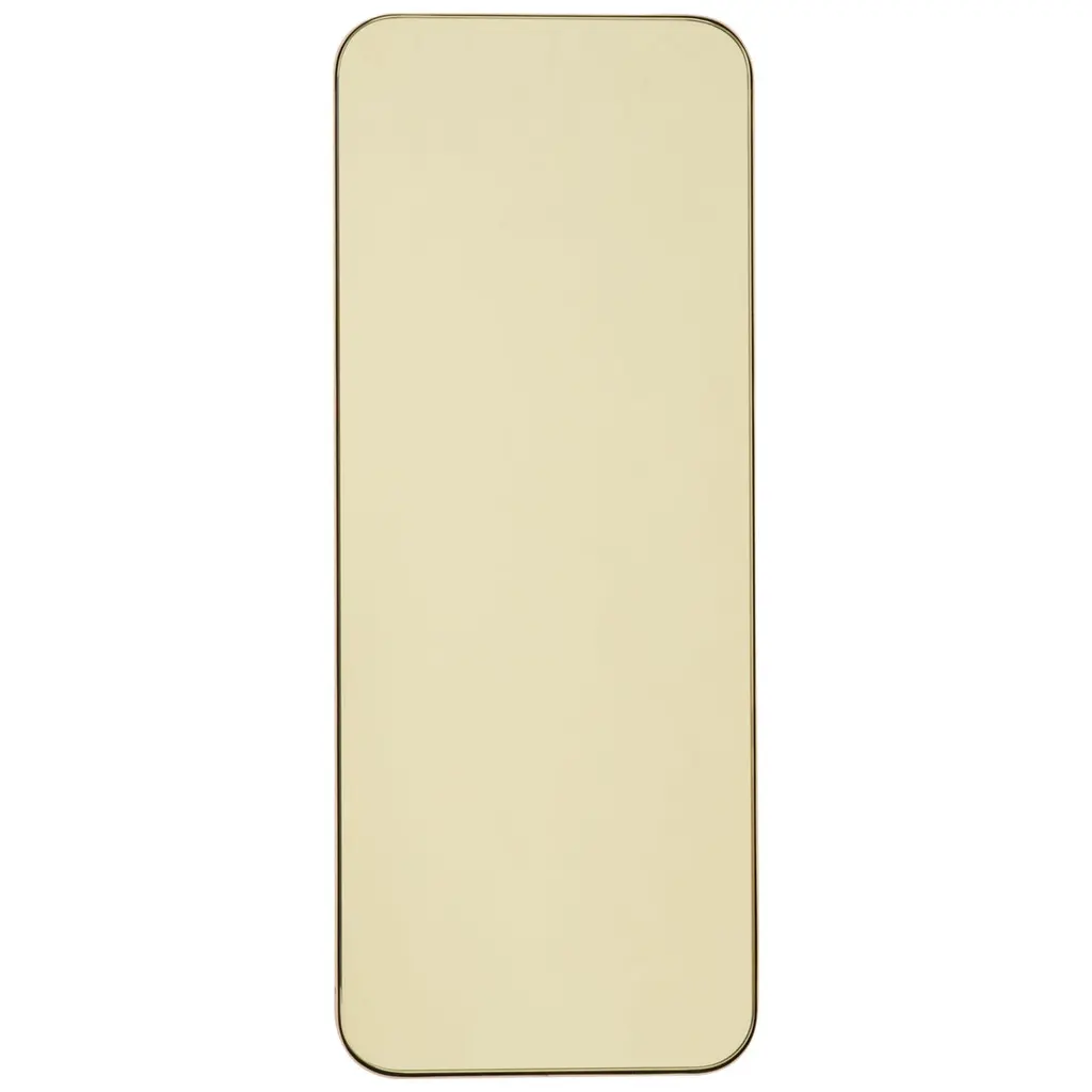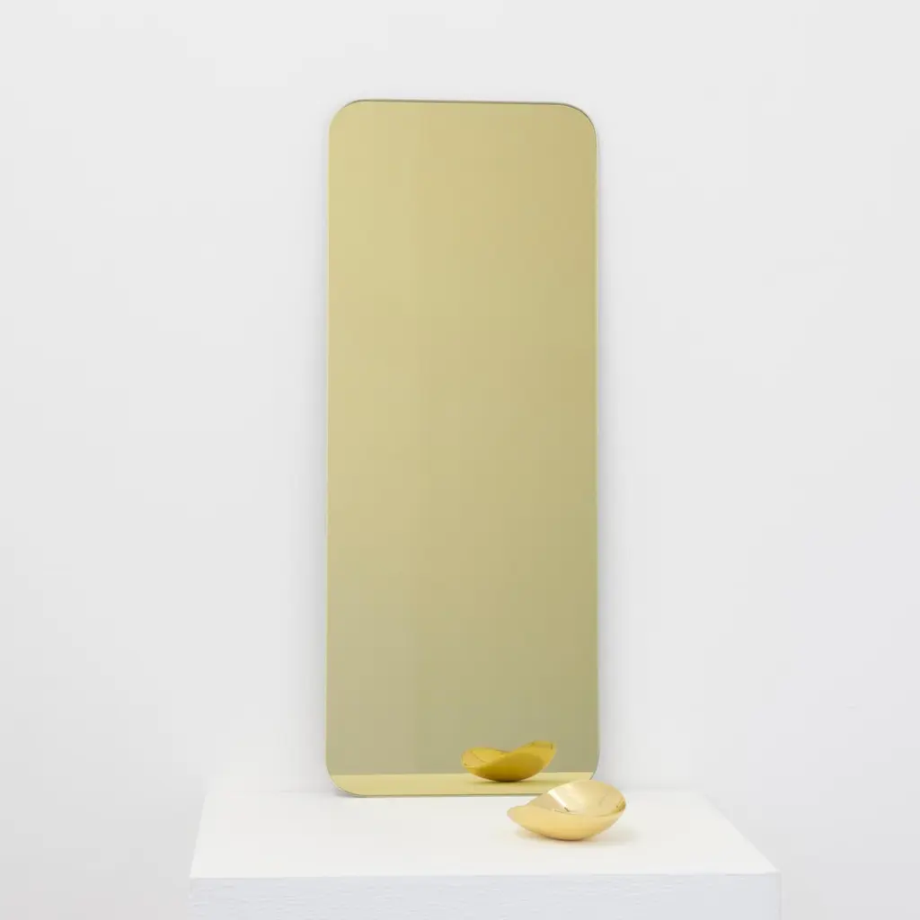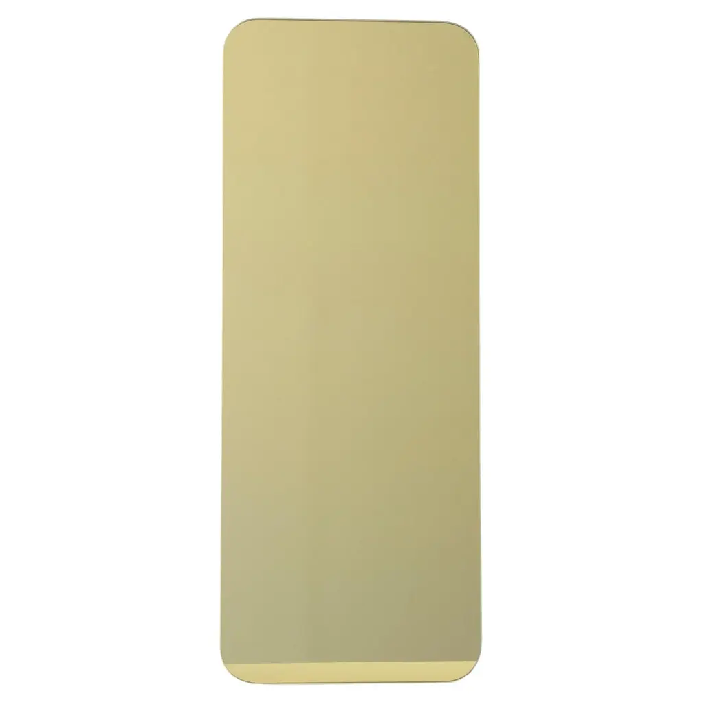 Minimalist rectangular shaped frameless gold tinted mirror with a floating effect. Quality design that ensures the mirror sits perfectly parallel to the wall. Designed and made in London, UK.Fitted with professional plates not visible once installed for an easy and safe installation. Lined at the back with a quality safety film. Supplied with all accessories, including screws and wall plugs.This mirror is fully customisable. Shipped safely worldwide.The images show a small size, measuring 27cm x 68cm x 0.6cm / 26.8'' x 10.6'' x 0.24’’.Note that the standard hanging position for this mirror is vertical. If you wish for the mirror to be hanged horizontally, please let our team know and we may adapt the hanging system accordingly.ORDERS OF MULTIPLE MIRRORS OF THE SAME TYPE: Please contact us to receive a Packing and Shipping quote when ordering multiple mirrors of the same type. An order for multiple mirrors of the same type may not be accepted without extra packing and shipping fees. Thank you.