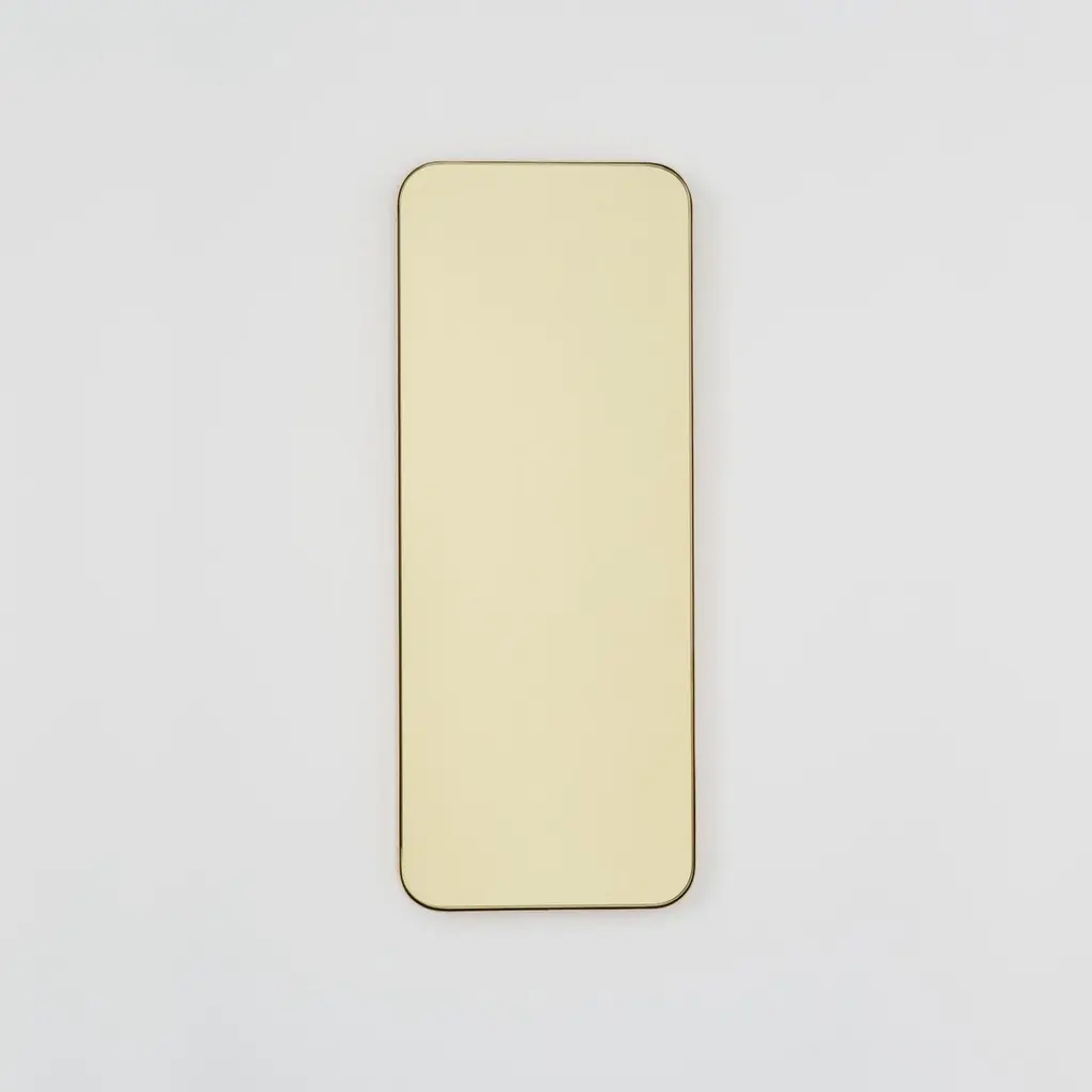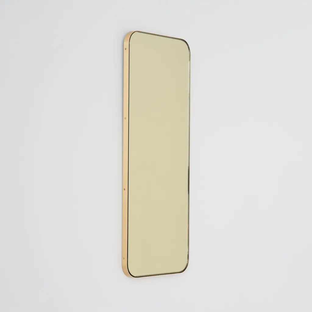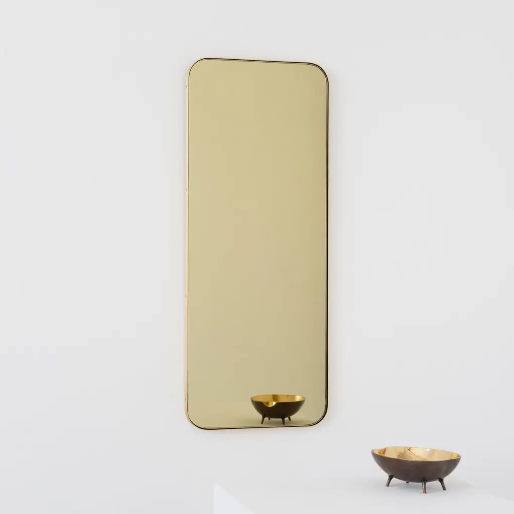 Modern gold tinted rectangular mirror with an elegant solid brushed brass frame. Part of the charming Quadris collection, designed and handcrafted in London, UK. Our mirrors are designed with an integrated French cleat (split batten) system that ensures the mirror is securely mounted flush with the wall. An alternative hanging hook or a Z-bar (depending on the size of the mirror) is available on demand for mirrors that need to be installed allowing some separation from the wall.The pictures show a small size, measuring 27cm x 68cm x 1.8cm / 10.6'' x 26.8'' x 0.71'' (see technical drawings for reference).This mirror is fully customisable and shipped safely worldwide.ORDERS OF MULTIPLE MIRRORS OF THE SAME TYPE: Please contact us to receive a Packing and Shipping quote when ordering multiple mirrors of the same type. An order for multiple mirrors of the same type may not be accepted without extra packing and shipping fees. Thank you.
